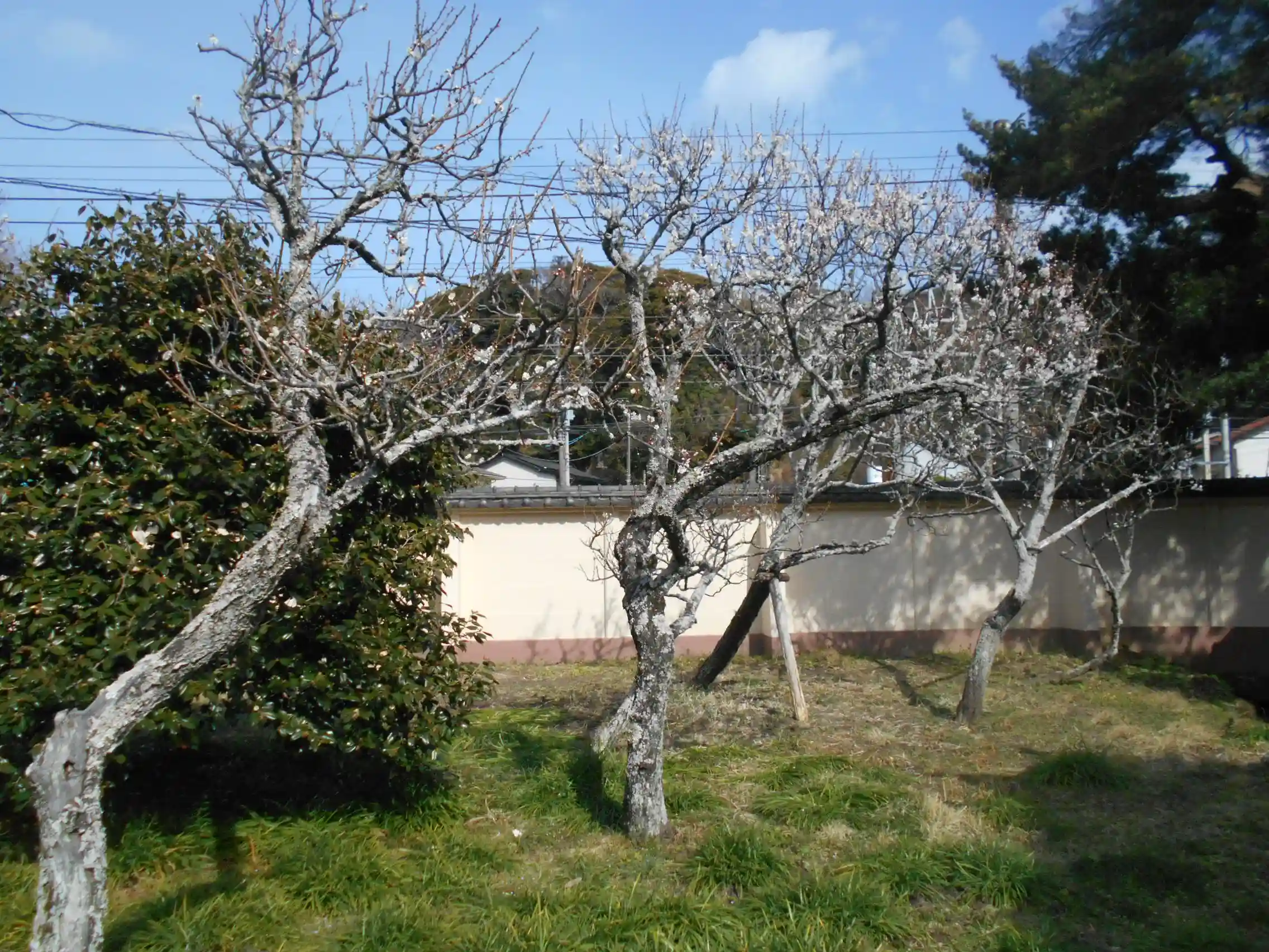 02-4) 寺務所周辺から仏殿の背面方向を背景に、梅の開花状況近景。