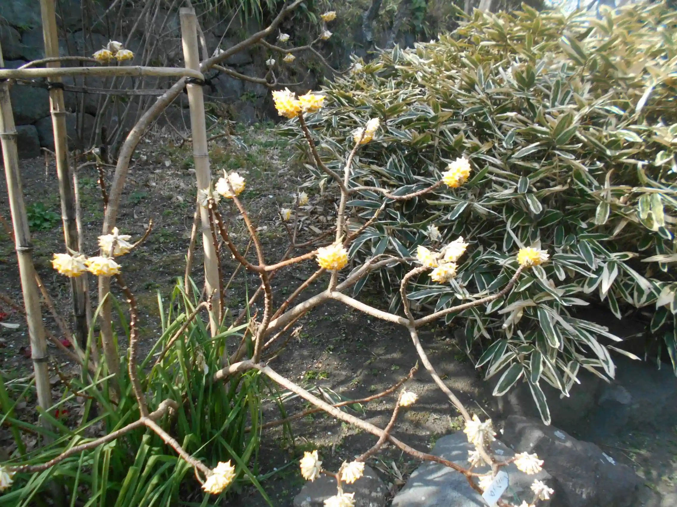 02-2) 向かって仏殿左側面側庭園、ミツマタの花。