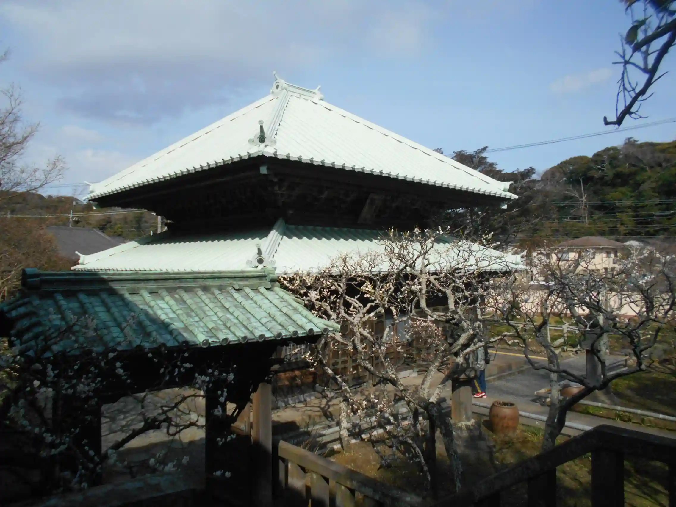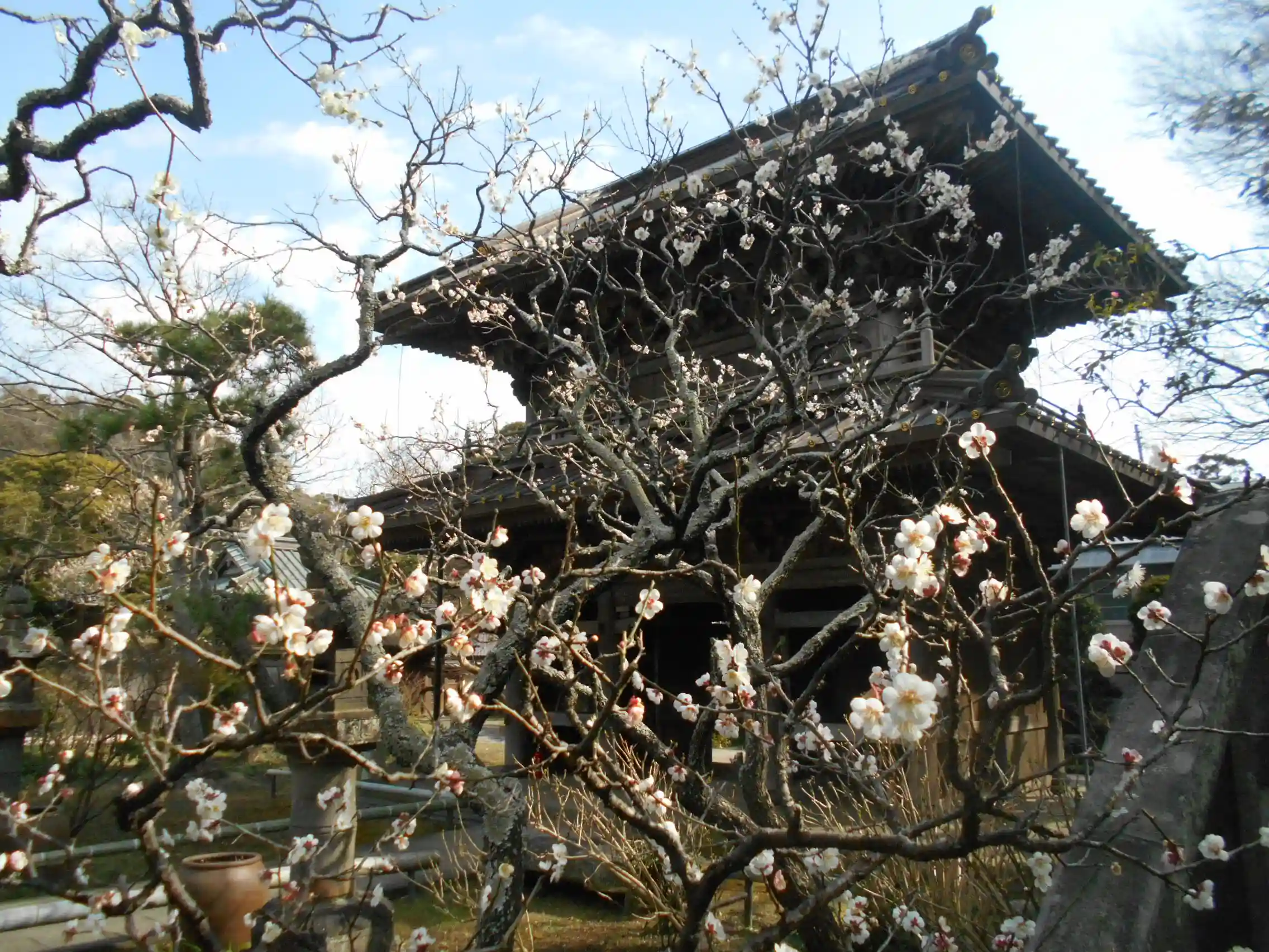 花が白飛びせぬよう 山門を背景に梅の開花状況。_ 鎌倉市扇ガ谷