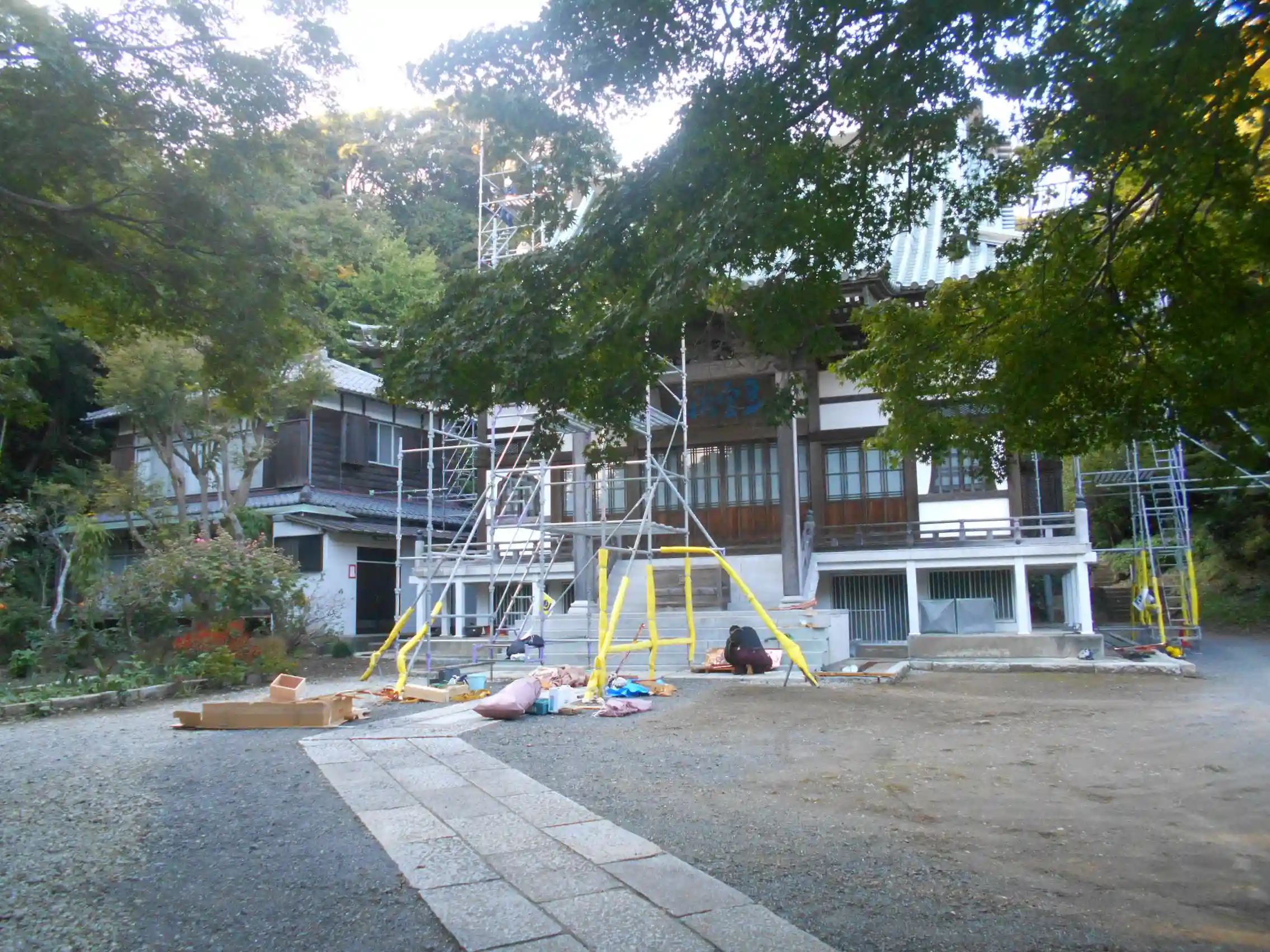 02-1) 修復工事中の本堂。