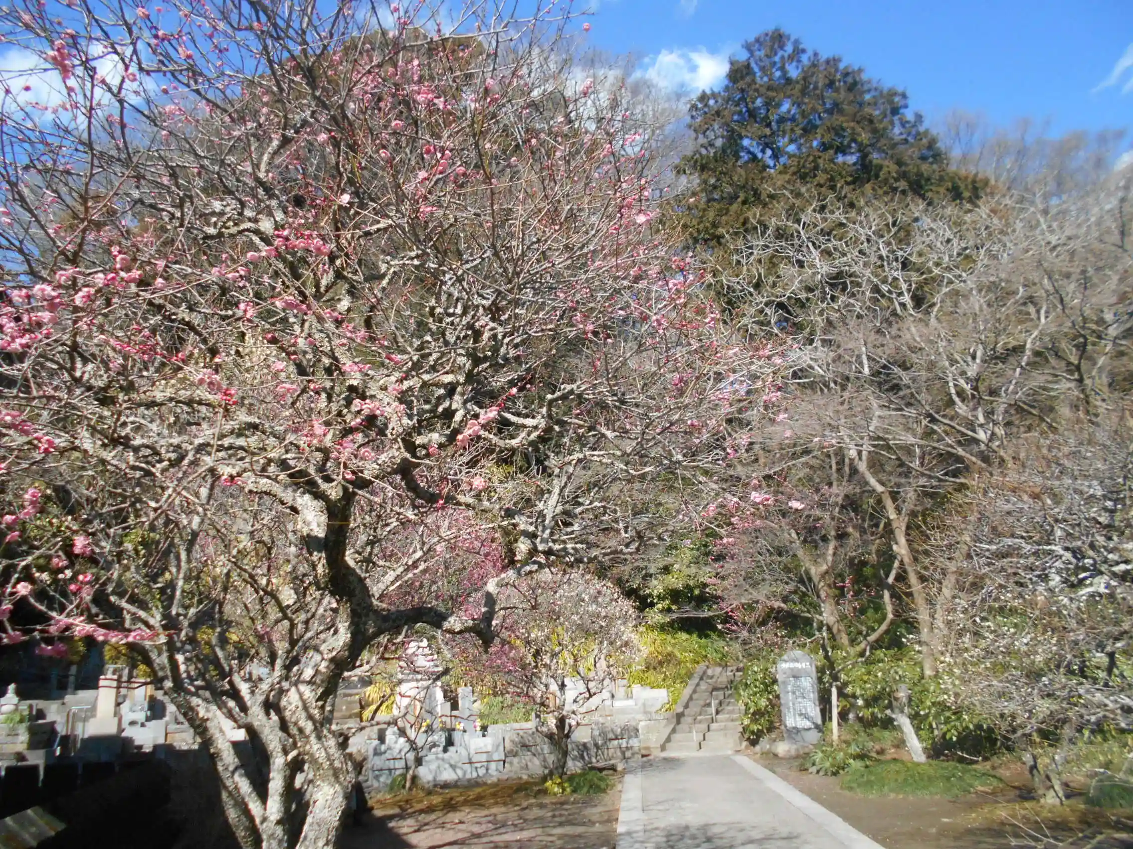 05) 梅の咲き始め具合を、白飛びせぬよう祖師堂方向を背景で。
