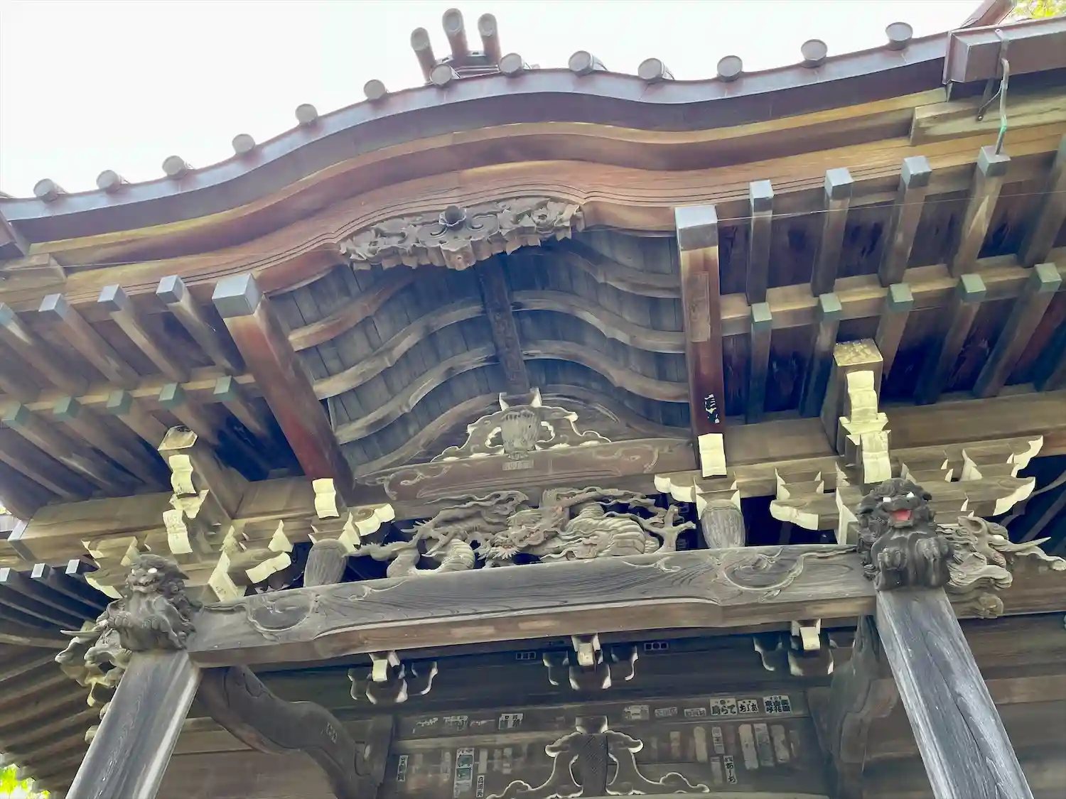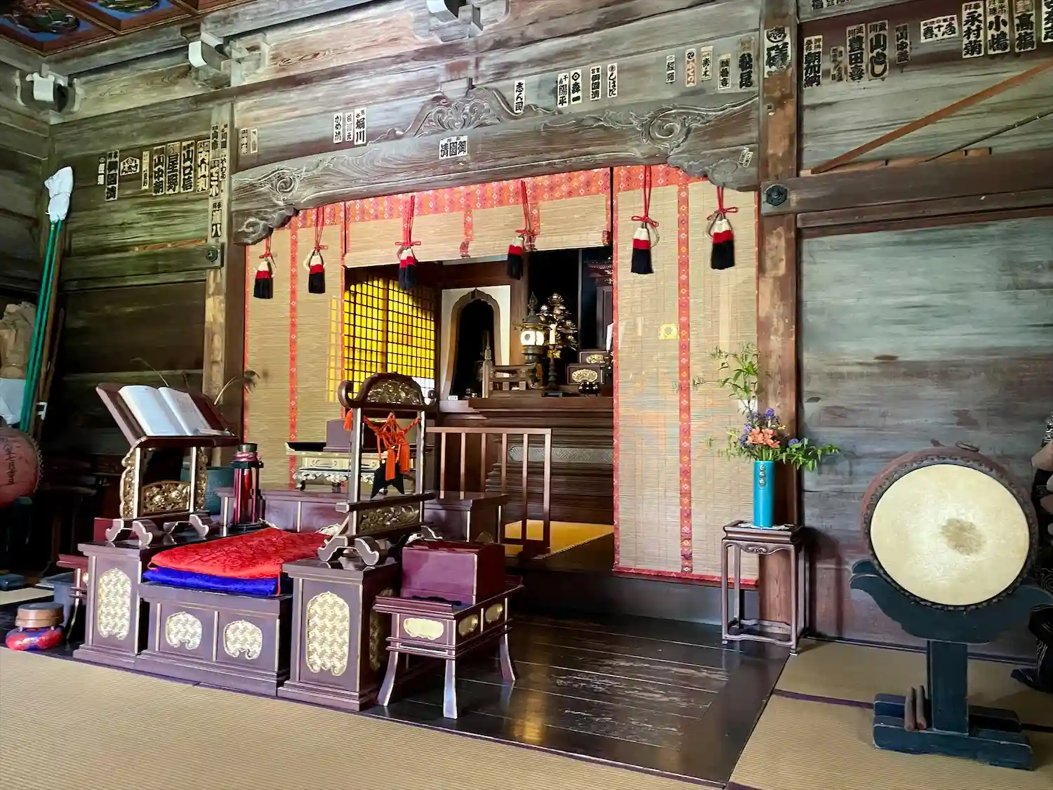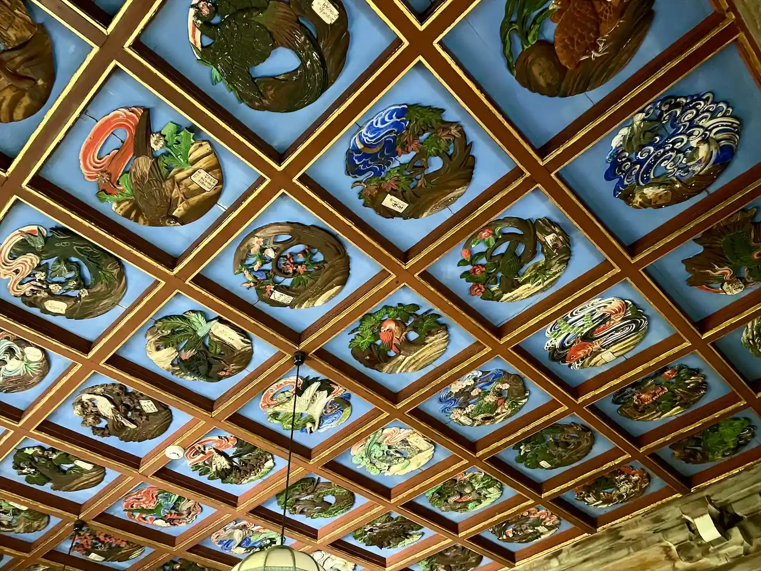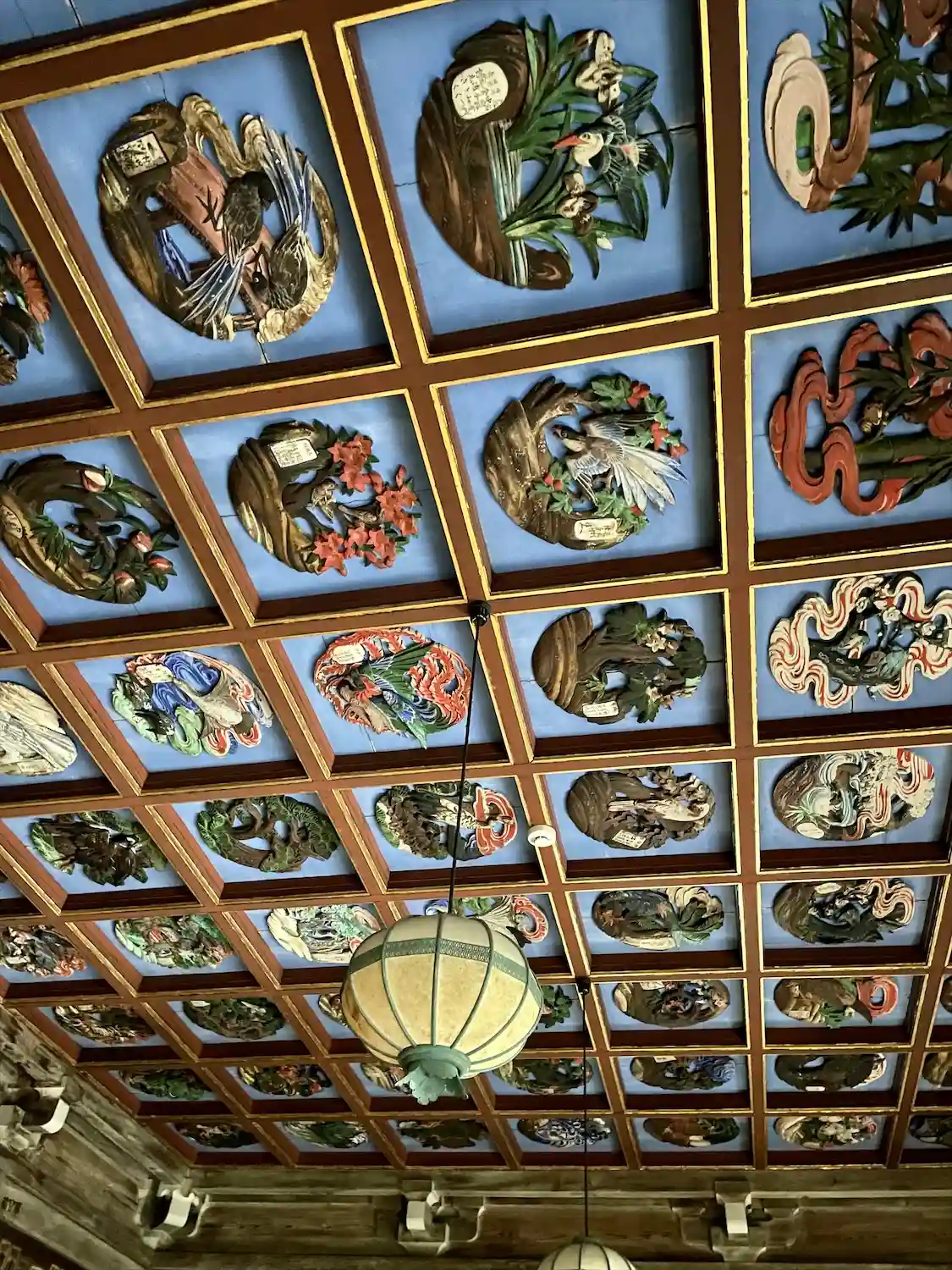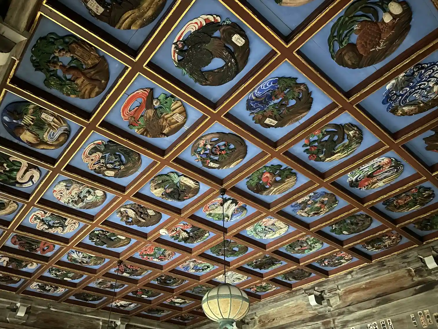(本堂天井の彫刻が鮮やかな彩色で素晴らしい)