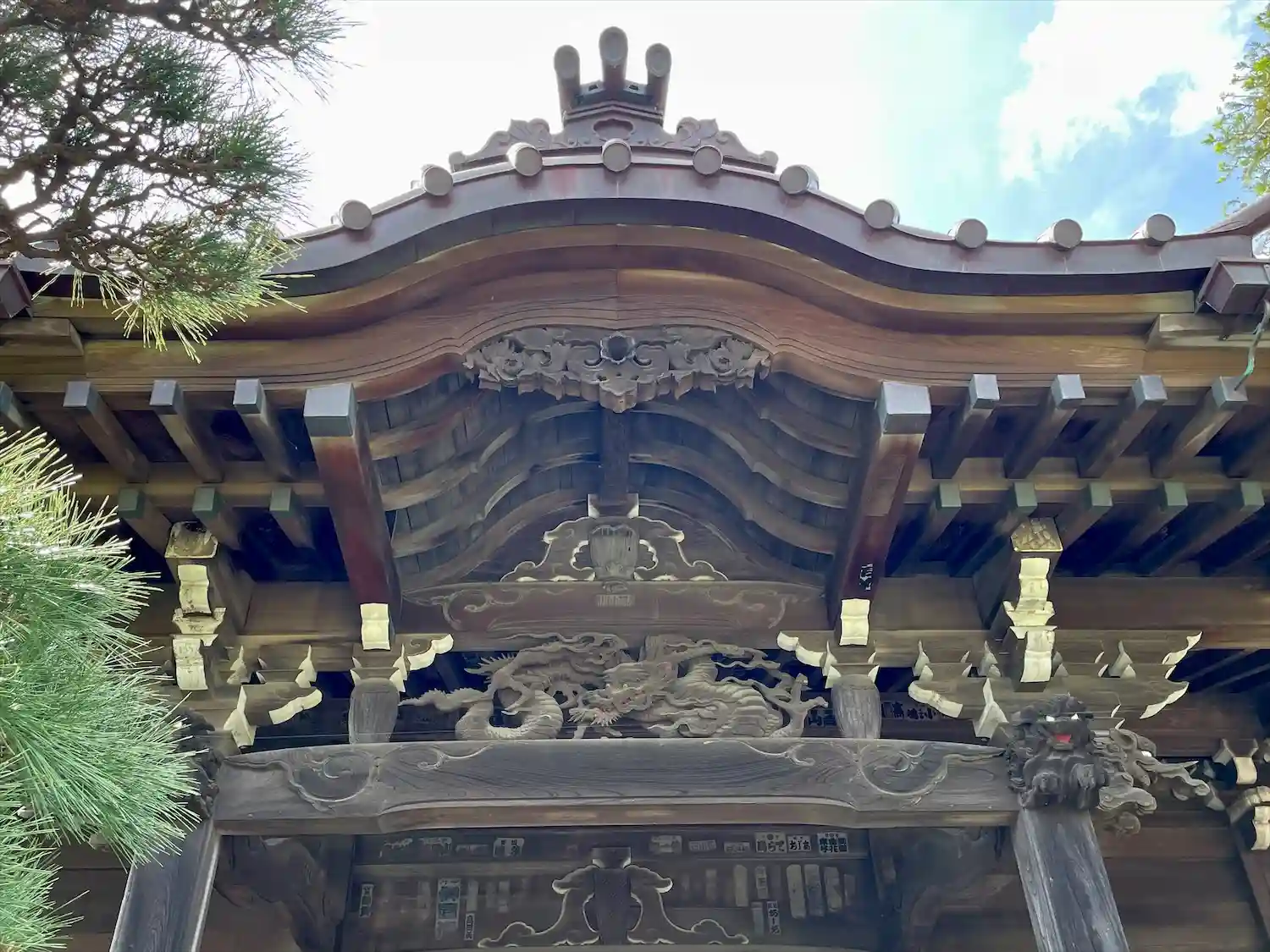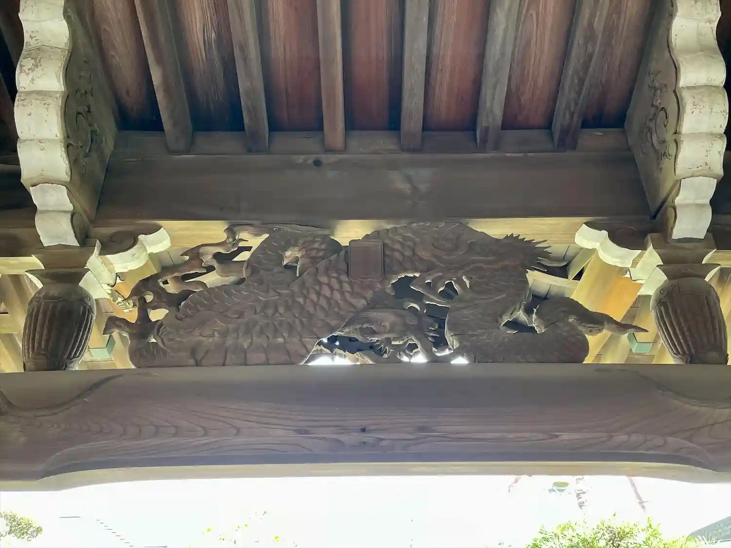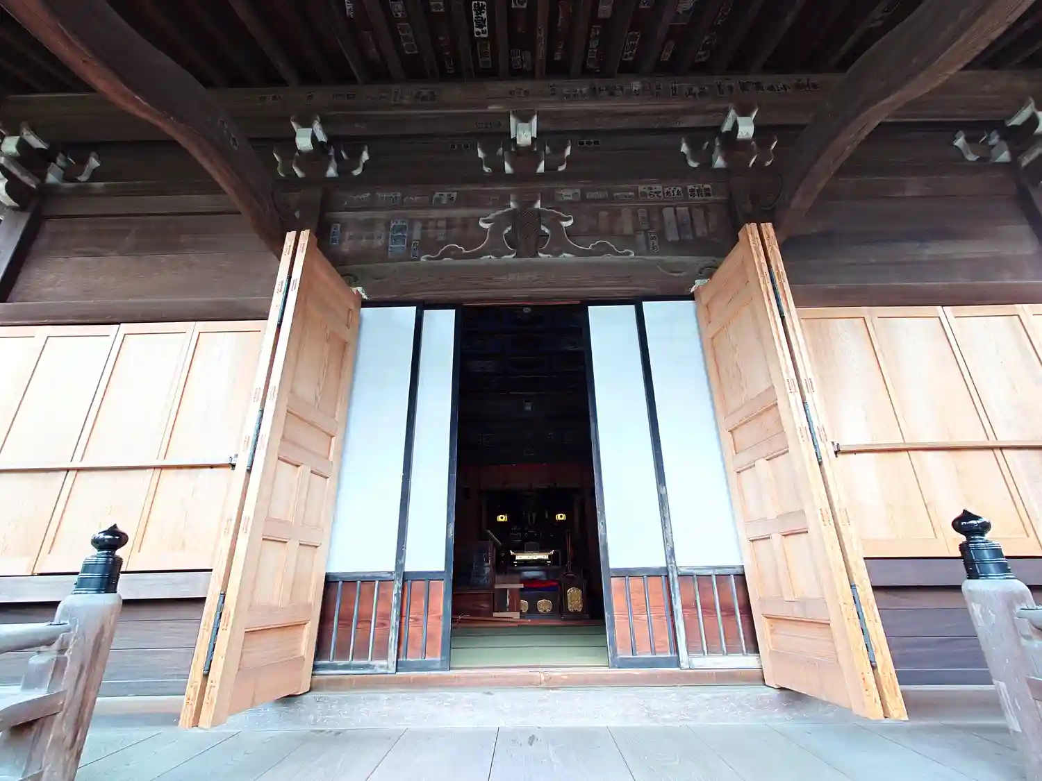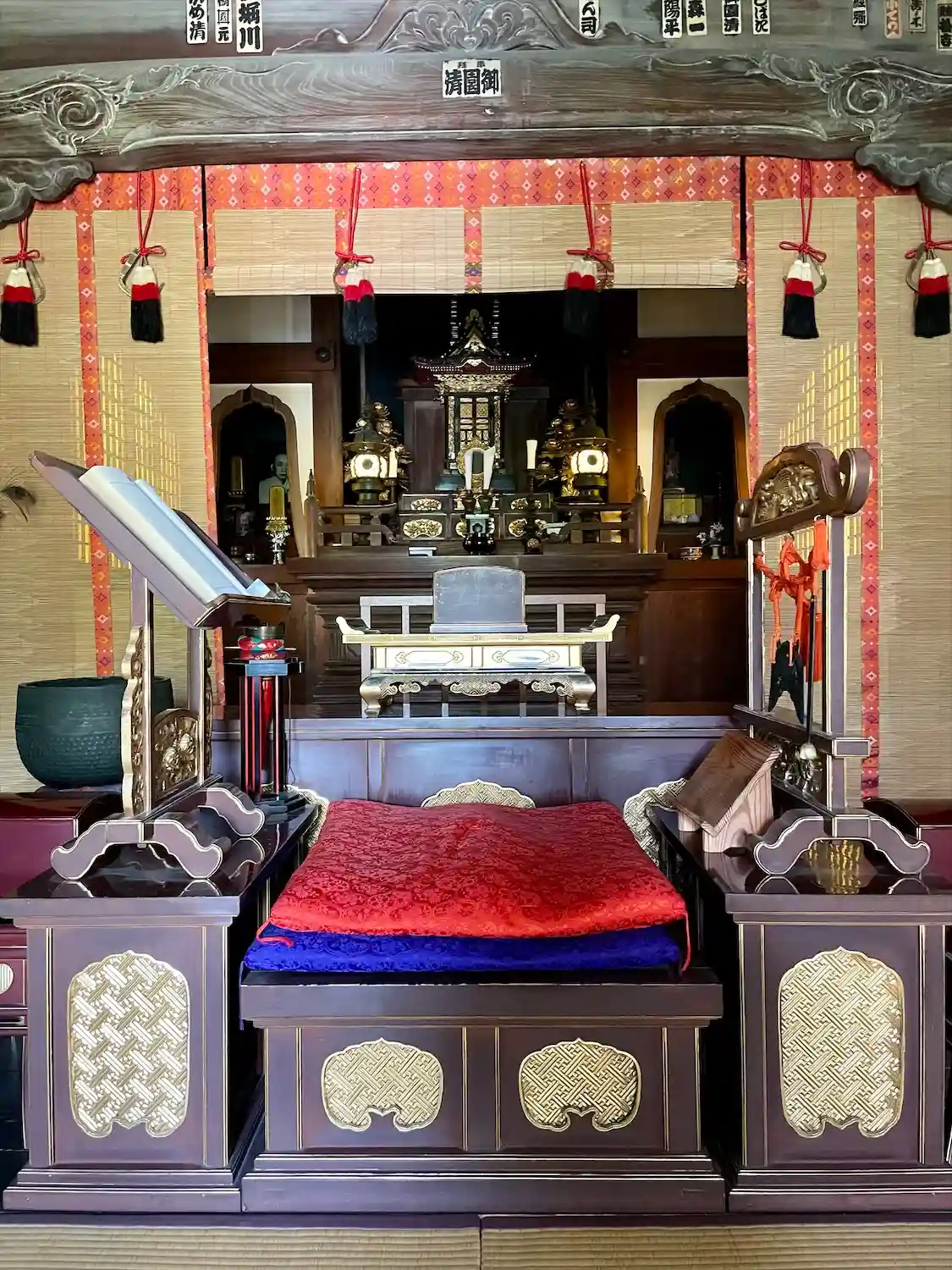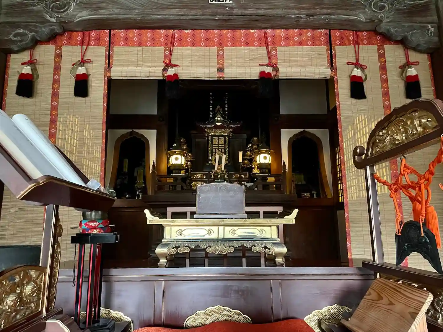(本堂天井の彫刻が鮮やかな彩色で素晴らしい)
