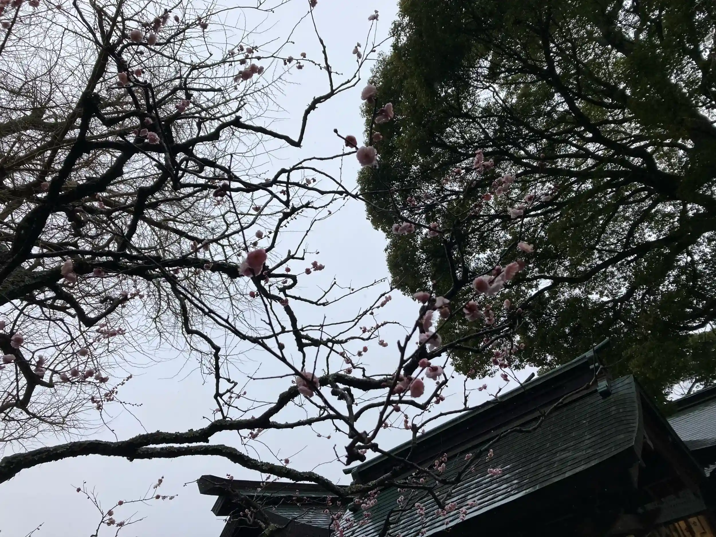 梅が健気で美しく、寒い境内を引き立てています。