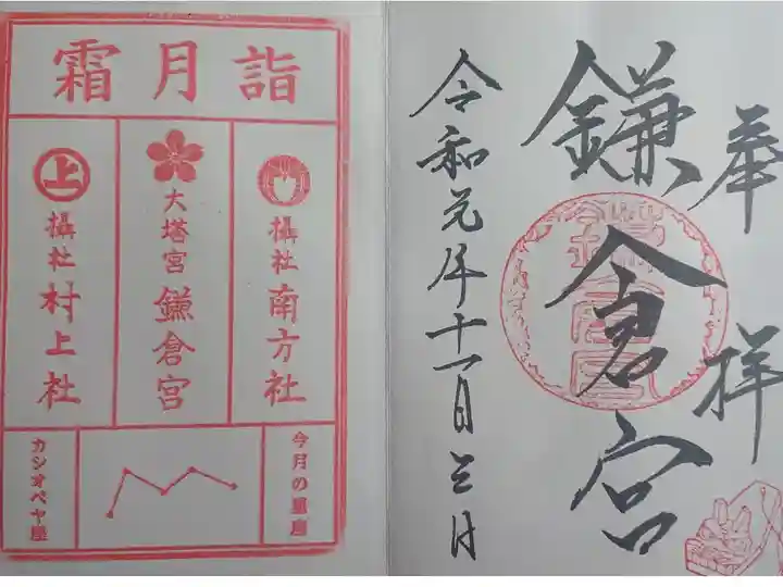 明治天皇が鎌倉幕府を討伐した護良親王を偲んで建立された鎌倉宮。紅白の鳥居が印象的で御朱印も色々ありました。