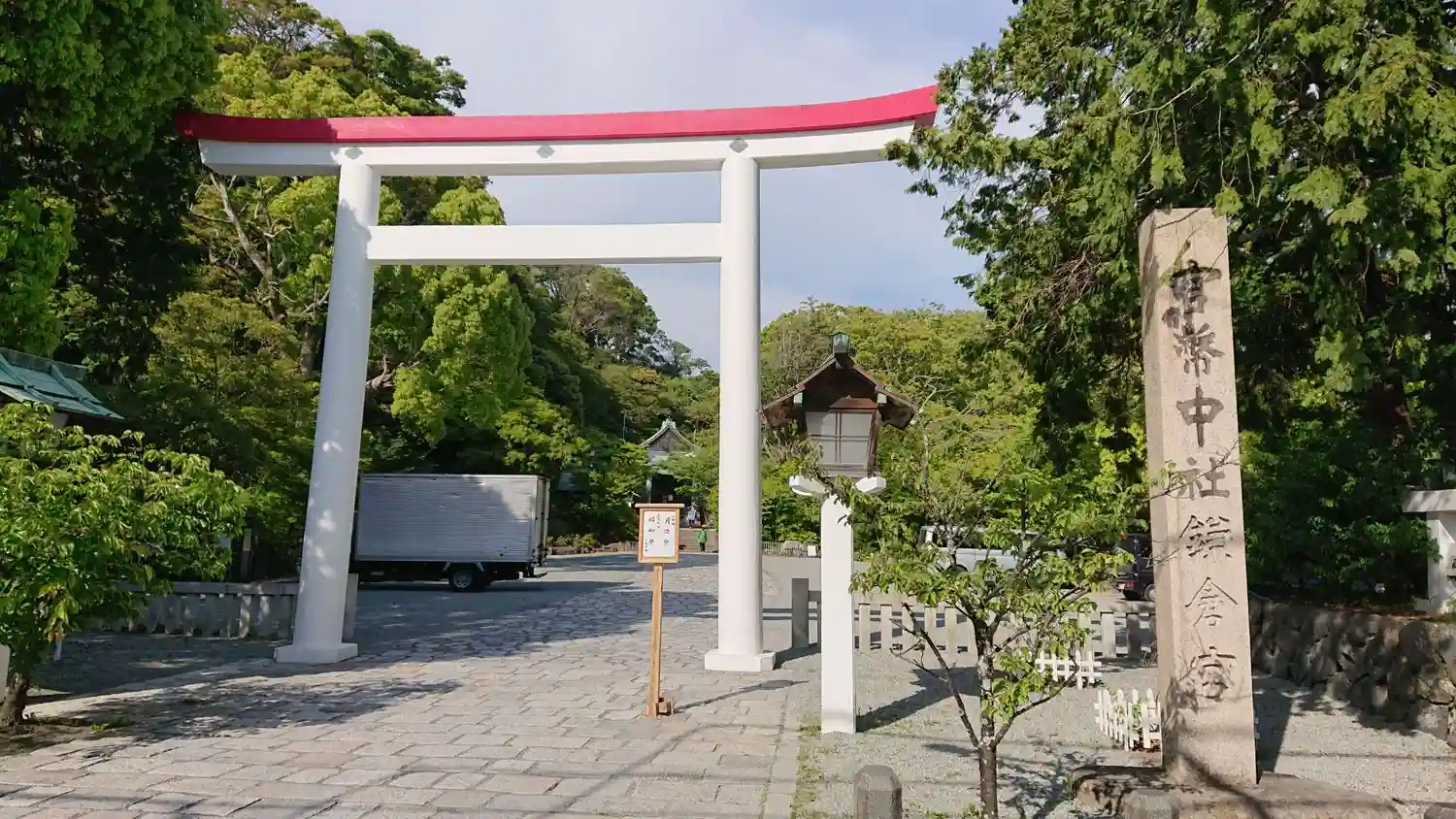 鳥居と社号標。鳥居は、白地にトップだけ朱色という珍しい配色。青空に映える。