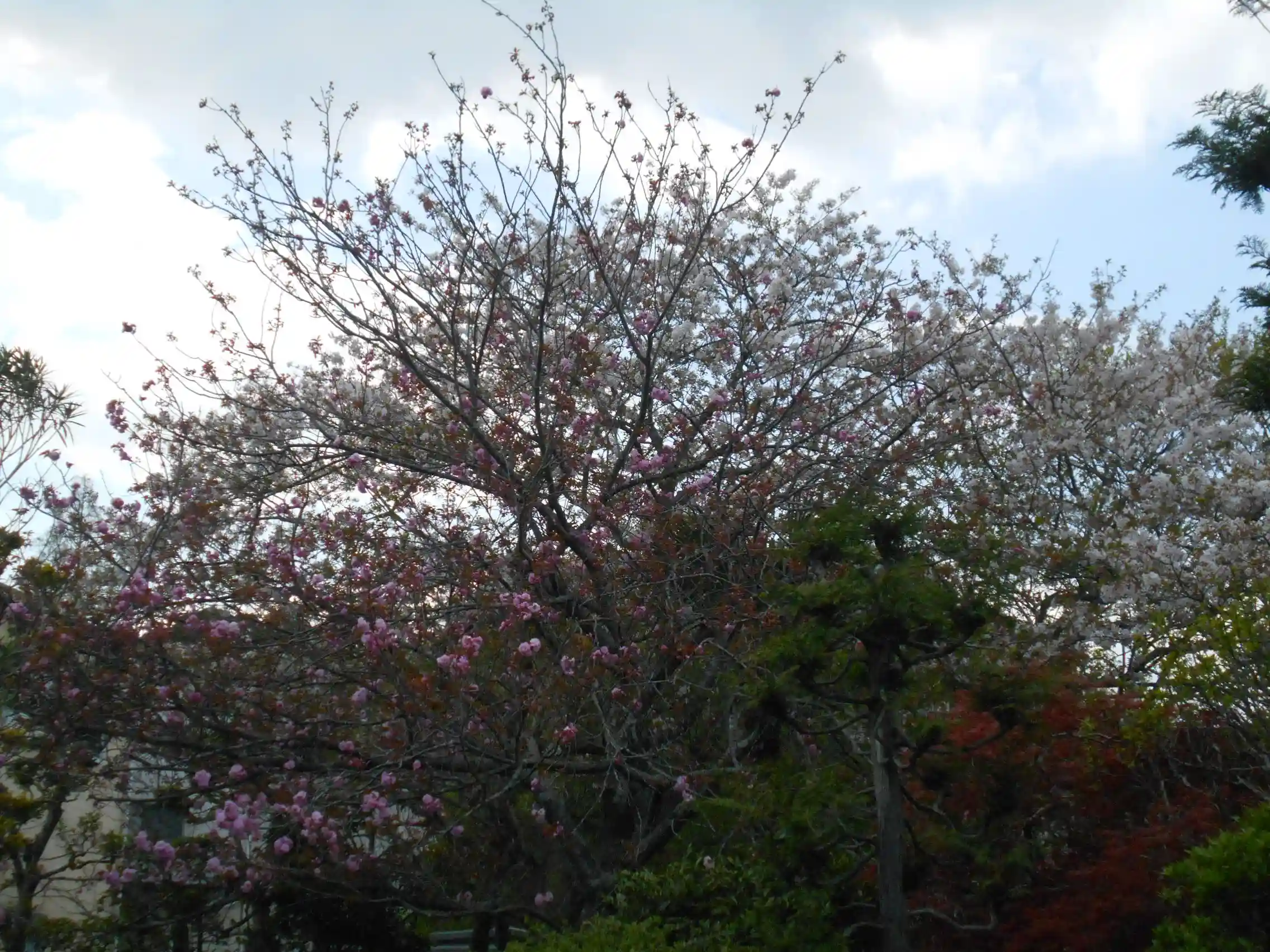 06-1) ’ 八重一重咲分け桜 ’ の開花を、宝物庫方向で。