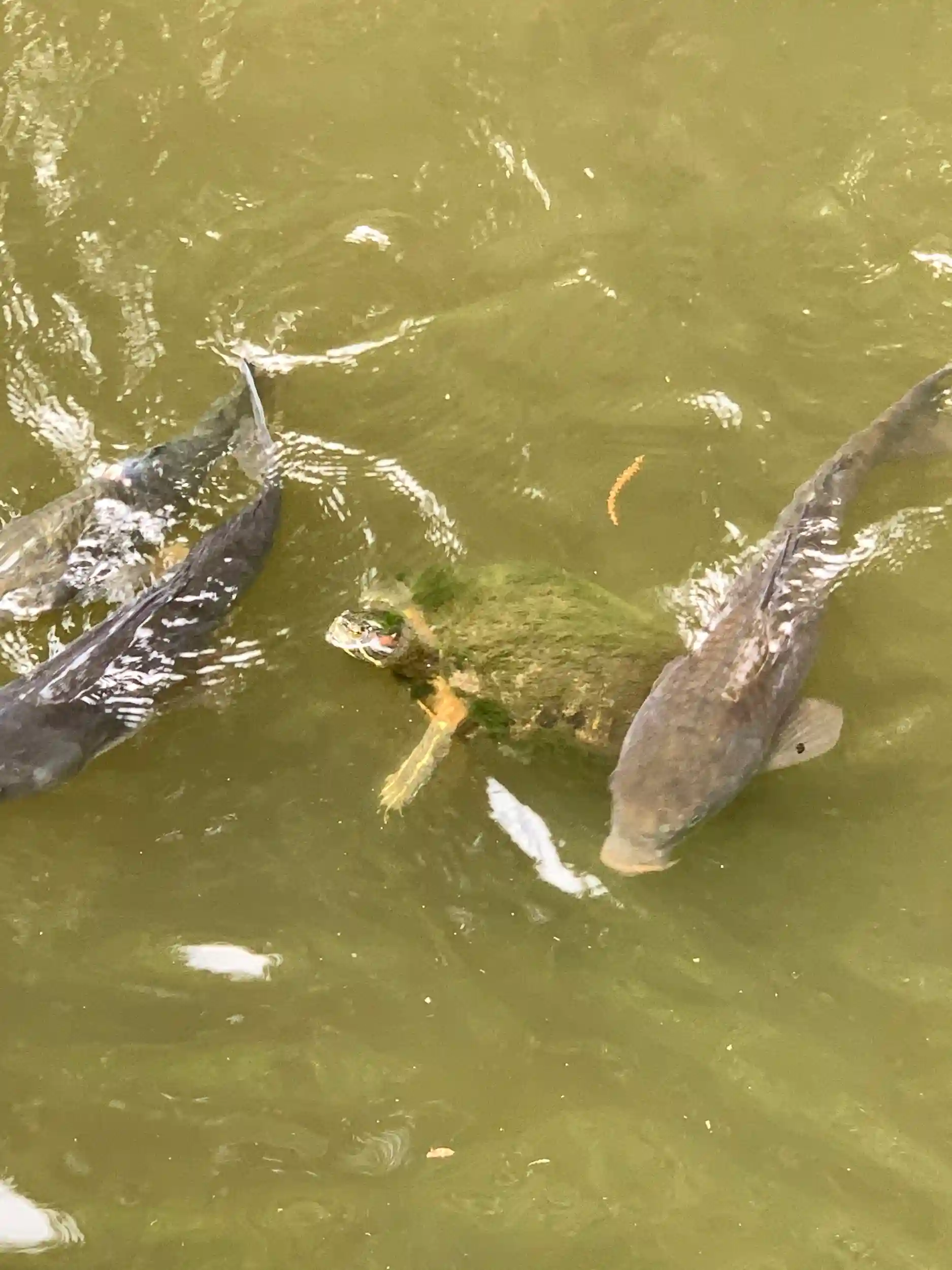 緑とトンボの写真、亀さんが鯉を引き連れてくるところ🐢🐟…