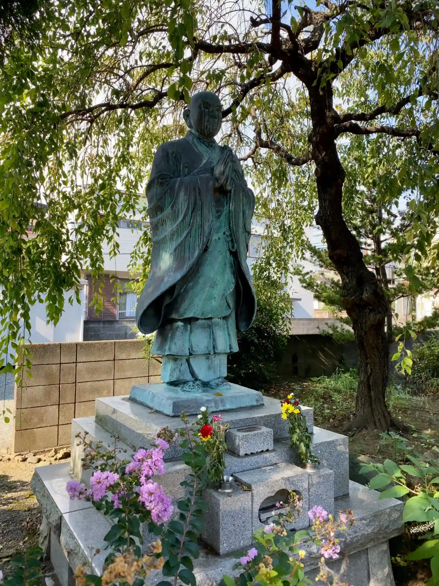しだれ梅の古木のもとの日蓮上人様。