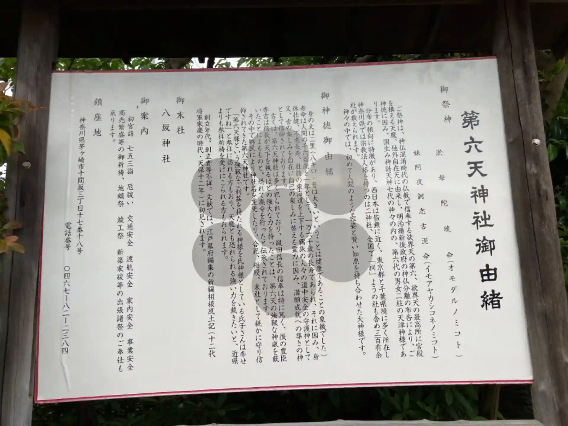 21.05.08。JR茅ヶ崎駅北口より徒歩13分。茅ヶ崎市十間坂の国道1号線沿いに鎮座。社殿裏の黒松がパワースポットとして知られる。御祭神は淤母陀琉神(オモダルミノカミ)、訶志古泥神(カシコネノカミ)。