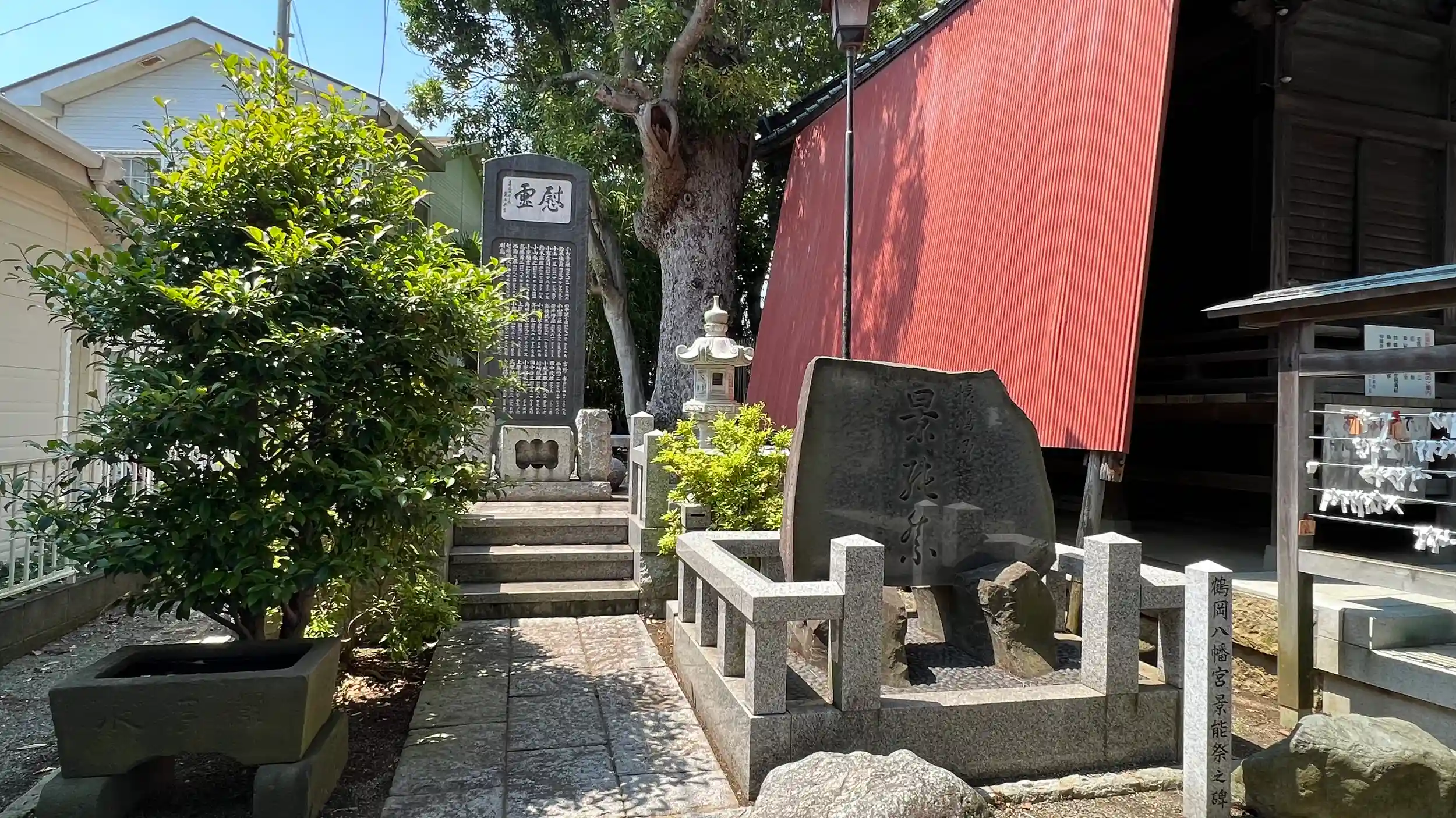 拝殿左側から神社の裏に行け「懐嶋館趾碑」「平景能・大庭景兼顕彰碑」「平景能の像」とある。場所自体は狭い。