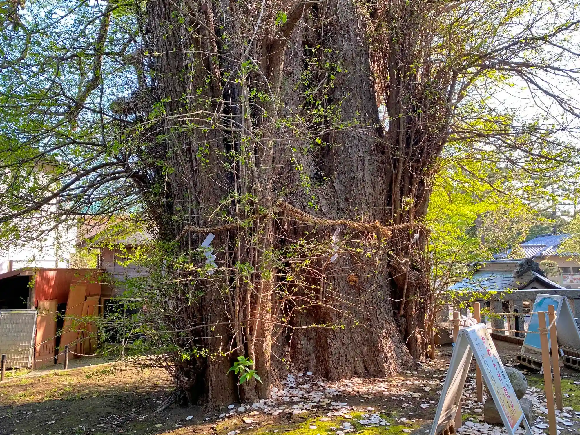拝殿に向かって右側に立つ<銀杏の古木>。強烈な太さ。社伝によると樹齢千年、高さ29m、目通り9m。何本もの幼木が癒着して成長した珍しいものらしい。