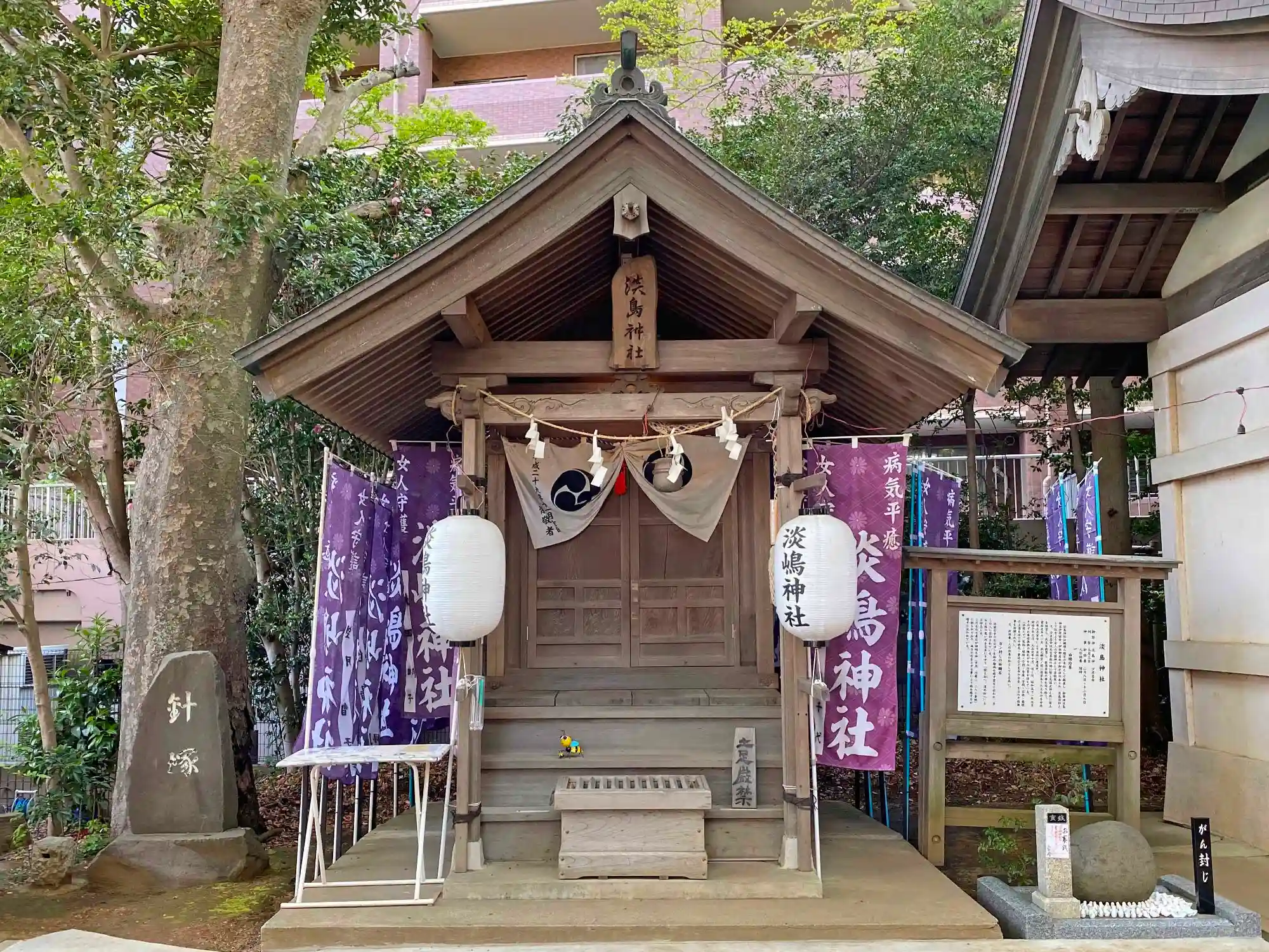 拝殿に向かって左側に建つ、末社<淡島神社>。社殿の左側に<針塚>、右側に<ガン封じの祈願石>がある。