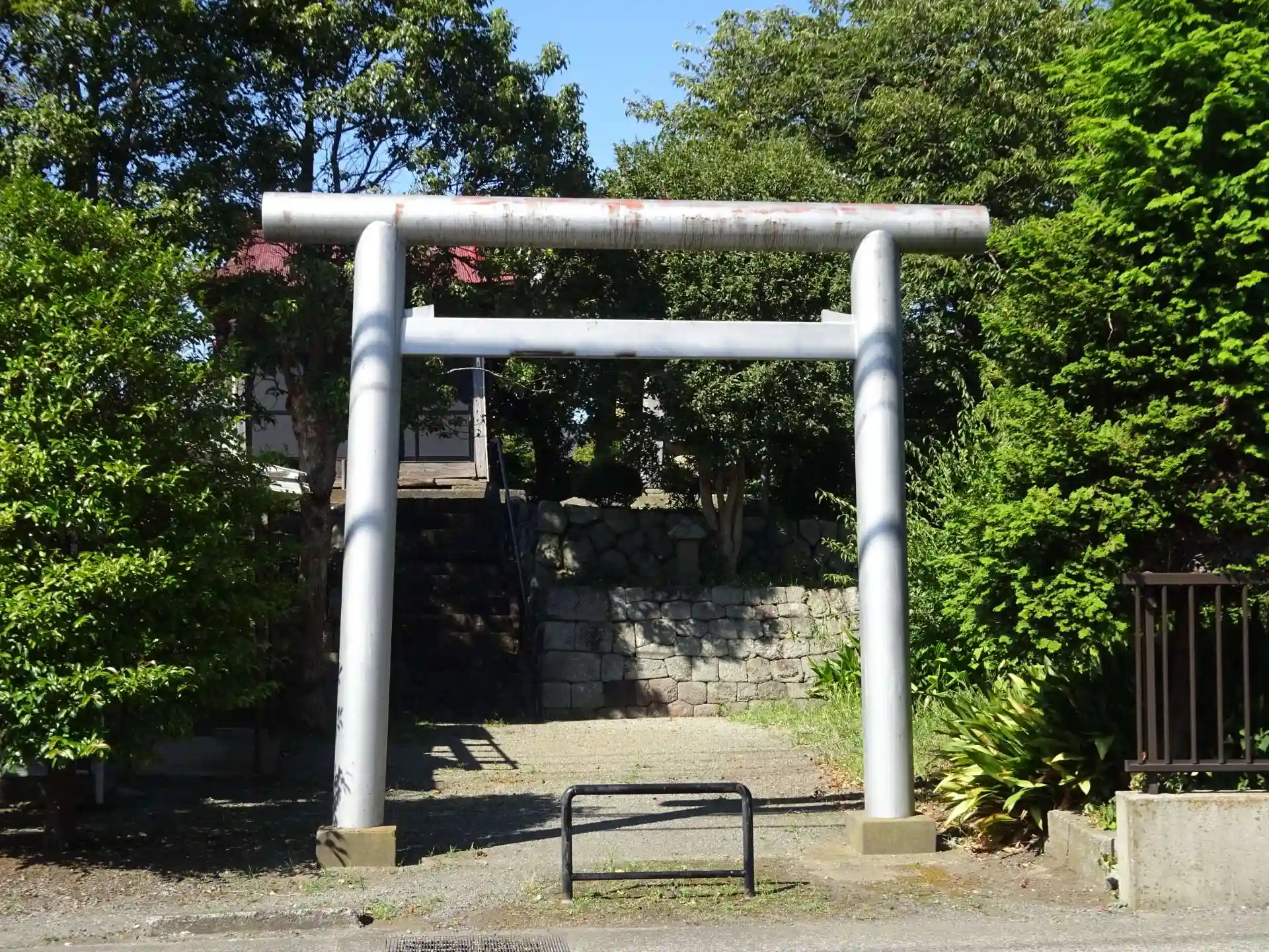 景観寺のお隣にある小さな神社 車道に面した銀灰色の鉄の鳥居が目を引く神社です