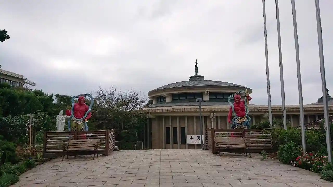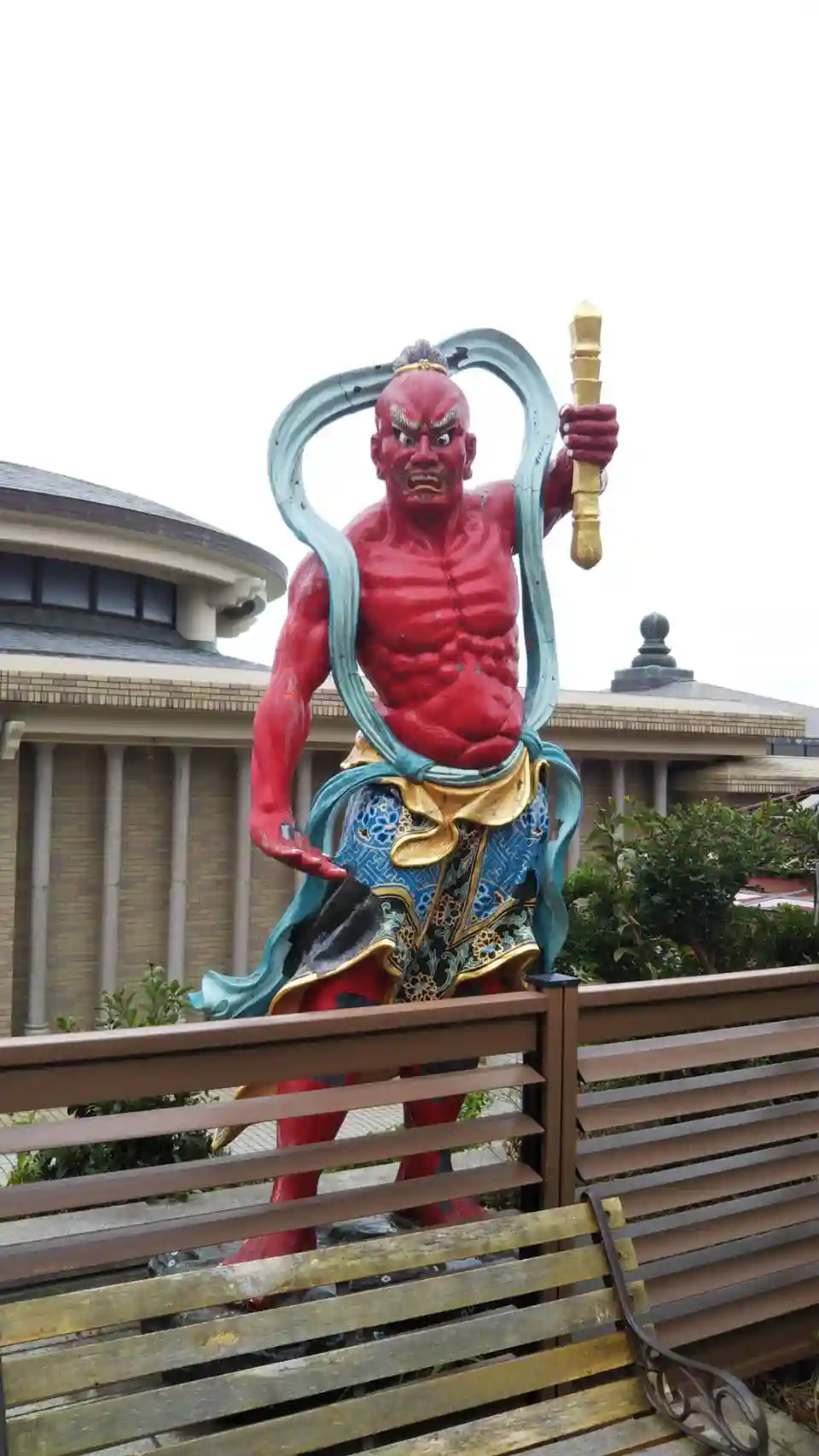 近代的な建物の前に赤い仁王像。