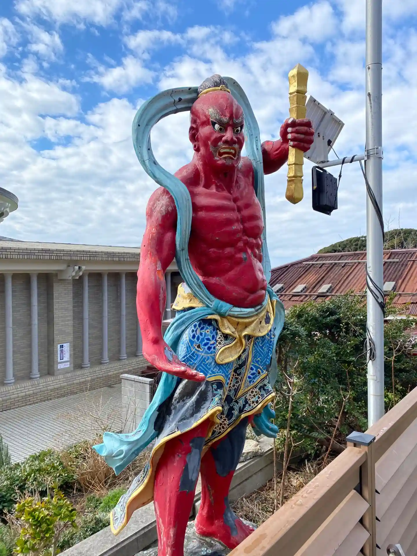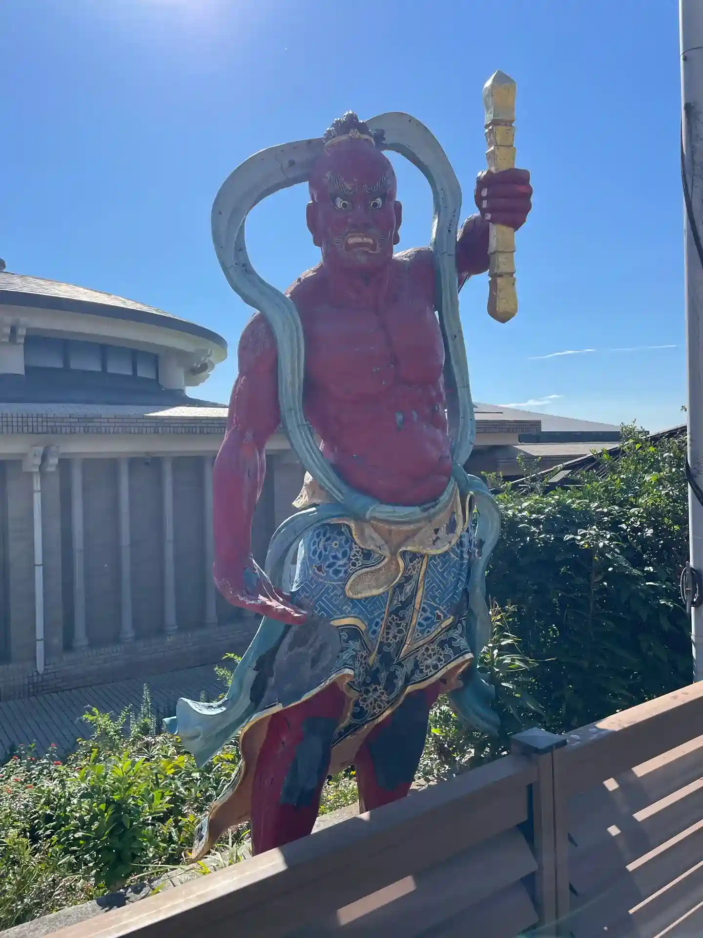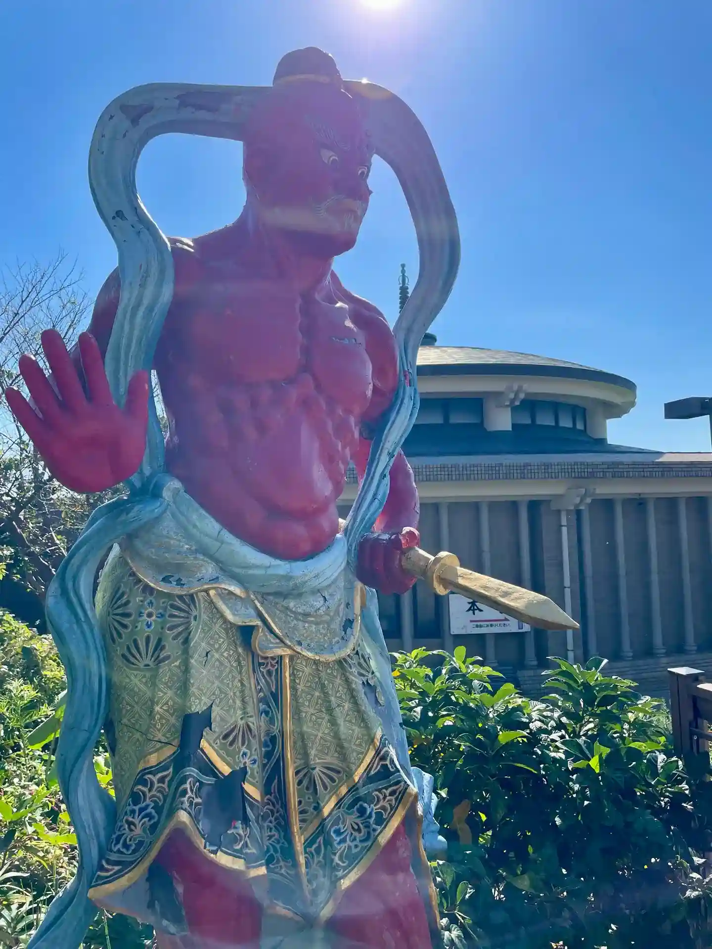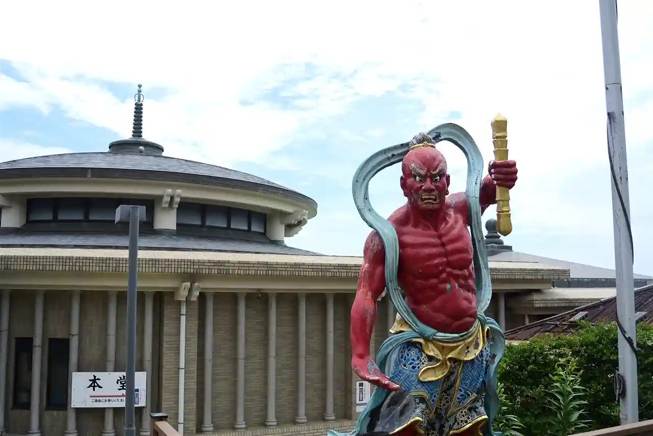 近代的な建物の前に赤い仁王像。