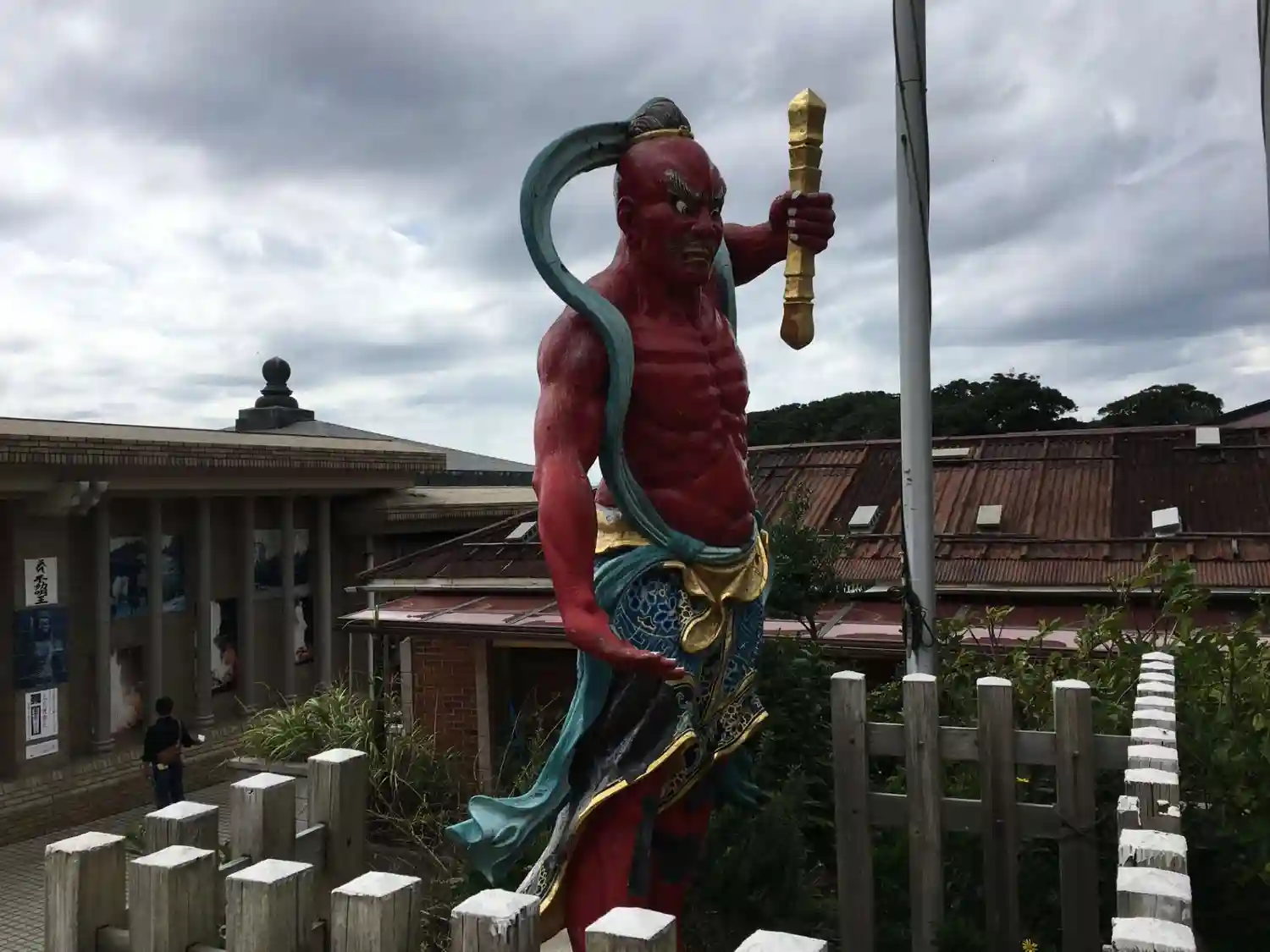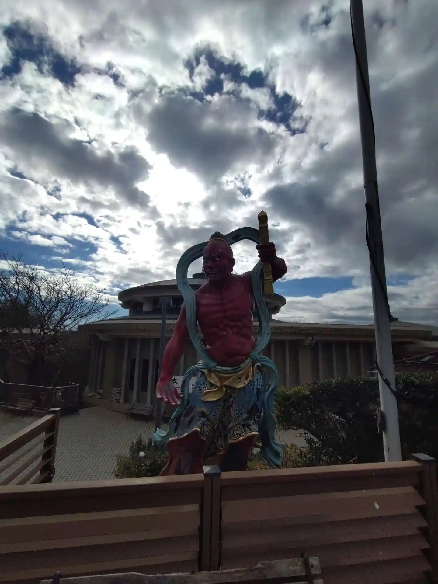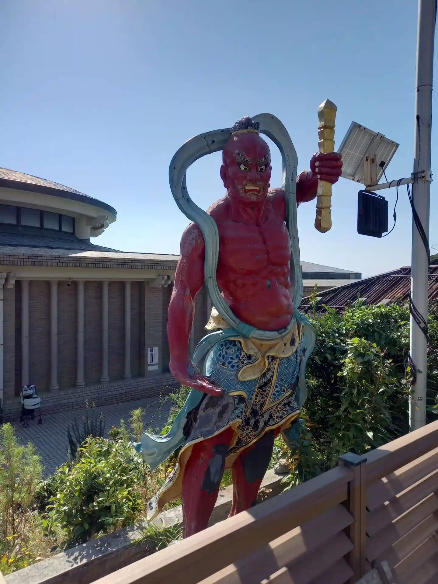 近代的な建物の前に赤い仁王像。