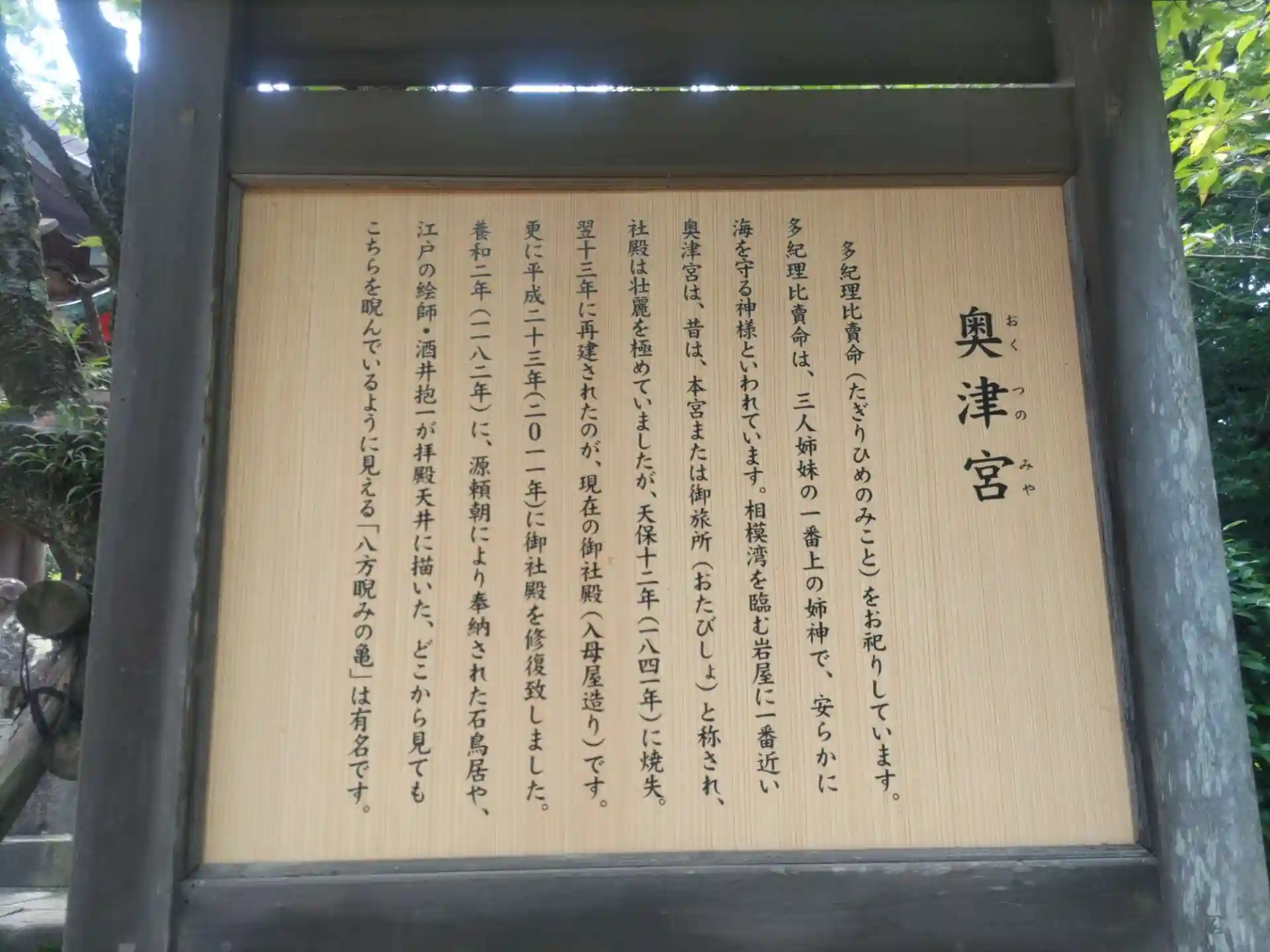 御祭神は、多紀理比賣命(たぎりひめのみこと)です。江島神社は三姉妹の女神様が祀られ、ここ奥津宮の御祭神は一番上の姉神です。