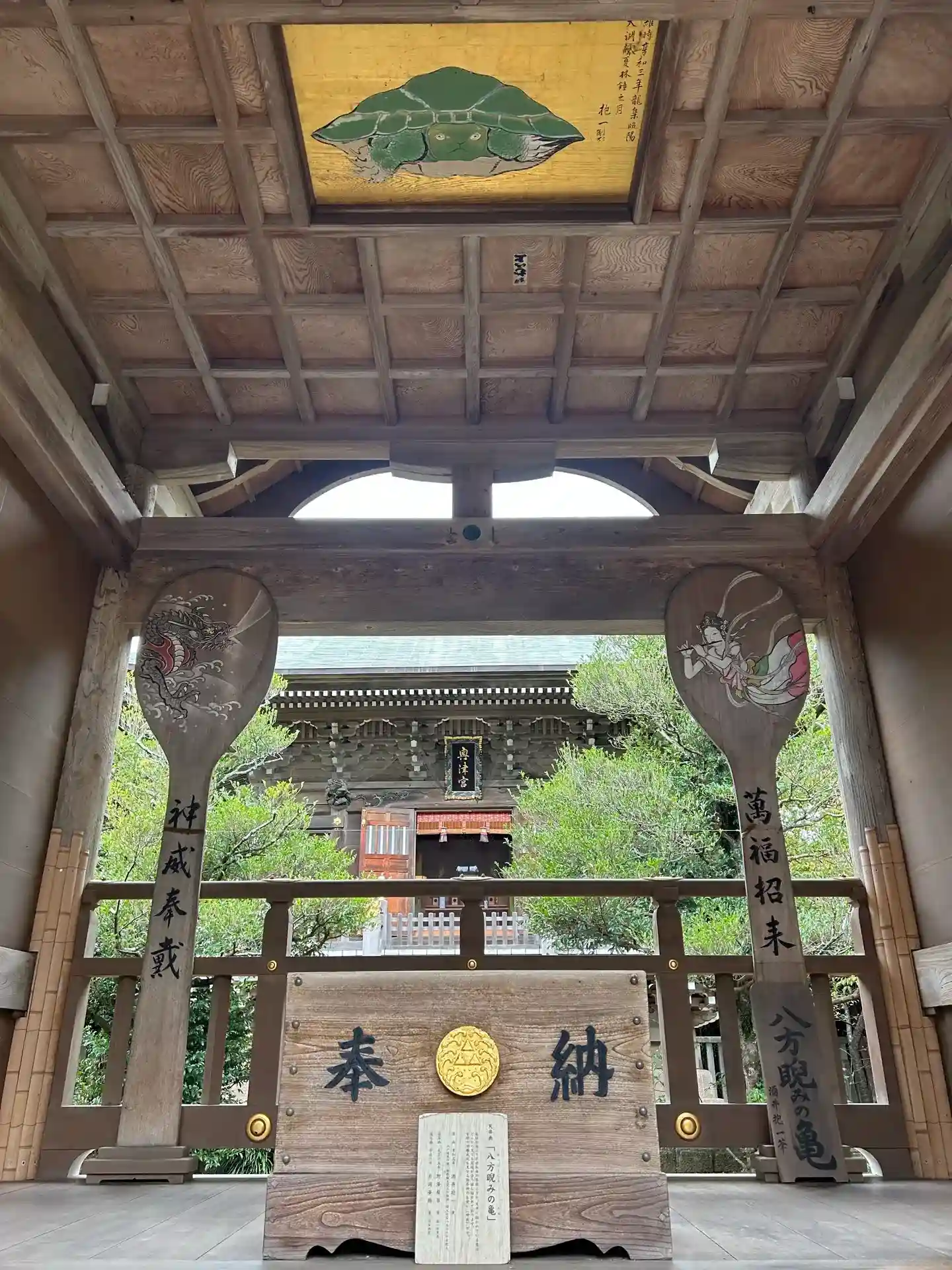 拝殿天井には八方睨みの亀が描かれている。どこから見ても睨まれているように見えることから、そう呼ばれているそう。