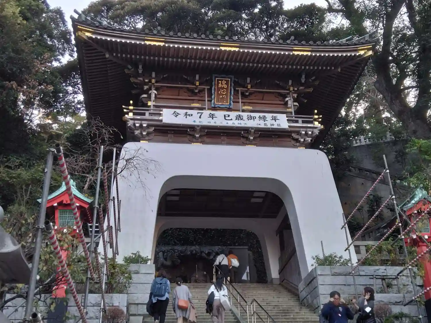 江ノ島大橋を渡り、島内の参道を上がると紅い大鳥居が見えてきます。