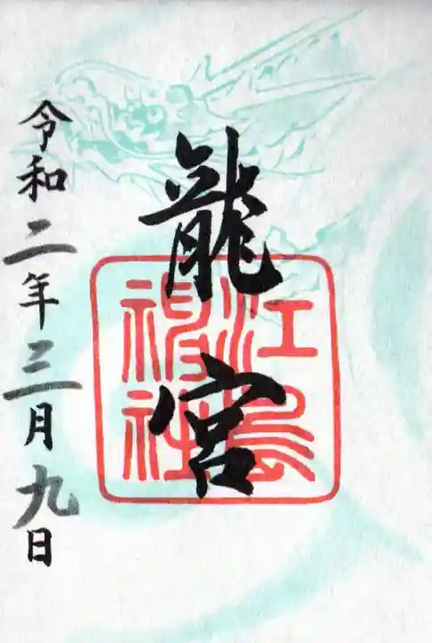 真ん中に龍宮と書かれ、全体に龍のイラストが入り、真ん中に江島神社の社印が押されています。