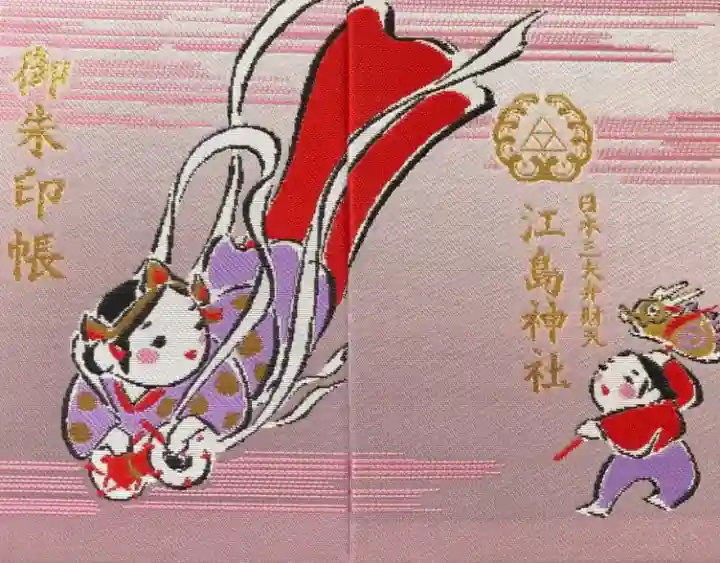ピンク色の地に、表面は天女(弁財天)が描かれ、左上に御朱印帳の文字、裏面は右下に童子と動物、真ん中に神紋(向かい波三つ鱗)と日本三大弁財天 江島神社の文字が入っています。
