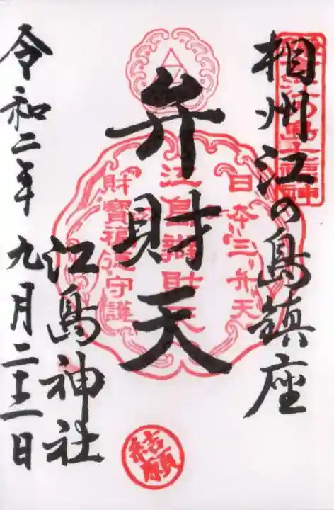 真ん中に邊津宮と書かれ、上部に神紋(向かい波三つ鱗)、真ん中に江島神社の社印が押されています。