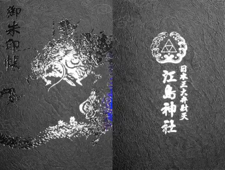 黒色の地に、迫力のある龍が描かれ、左上に御朱印帳の文字、裏面は真ん中に神紋(向かい波三つ鱗)と日本三大弁財天 江島神社の文字が入っています。
