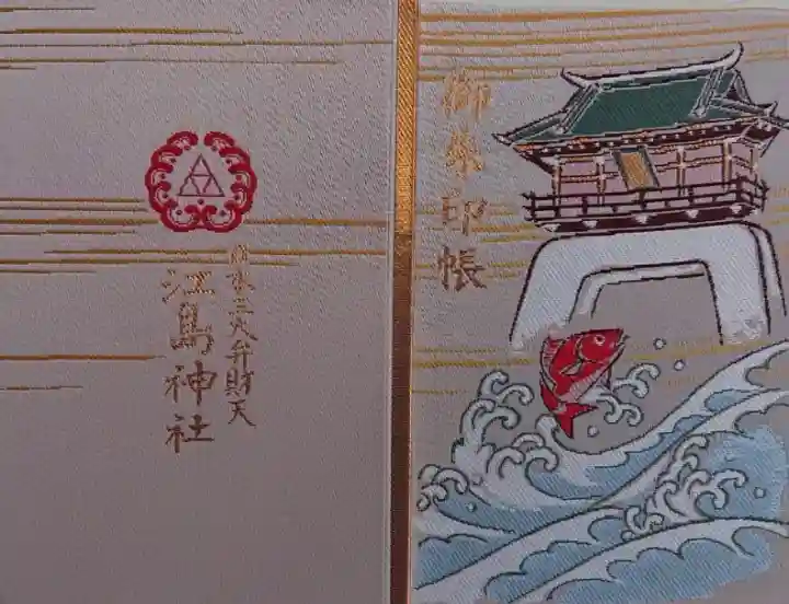 ベージュ色の地に、表面は上部に瑞心門(ずいしんもん)、下部に荒波と鯛が描かれ、左上に御朱印帳の文字、裏面は真ん中に神紋(向かい波三つ鱗)と日本三大弁財天 江島神社の文字が入っています。