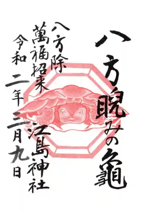 右に八方睨みの龜と書かれ、真ん中に八方睨みの亀の印、左上に八方除 萬福招来の文字、左下に江島神社の文字が入っています。