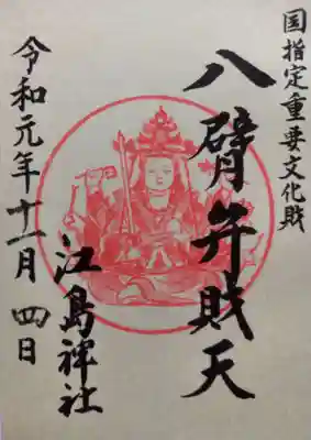 右に八臂弁財天と書かれ、右上に国指定重要文化財の文字、真ん中に八臂弁財天御尊像の印、左下に江島神社の文字が入っています。