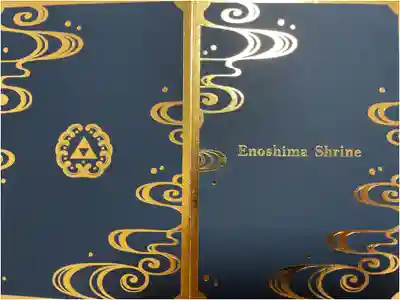 表面は湘南の海に、大きな波、江の島、富士山が見える風景が描かれ、右上に御朱印帳の文字、裏面は大海原に鯛が飛び跳ね、真ん中に神紋(向かい波三つ鱗)と日本三大弁財天 江島神社の文字が入っています。
