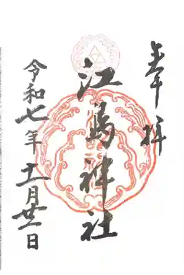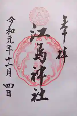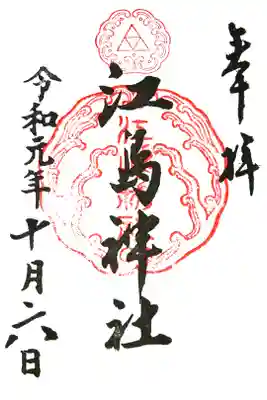 真ん中に江島神社と書かれ、上部に神紋(向かい波三つ鱗)、真ん中に江島神社の社印が押されています。
