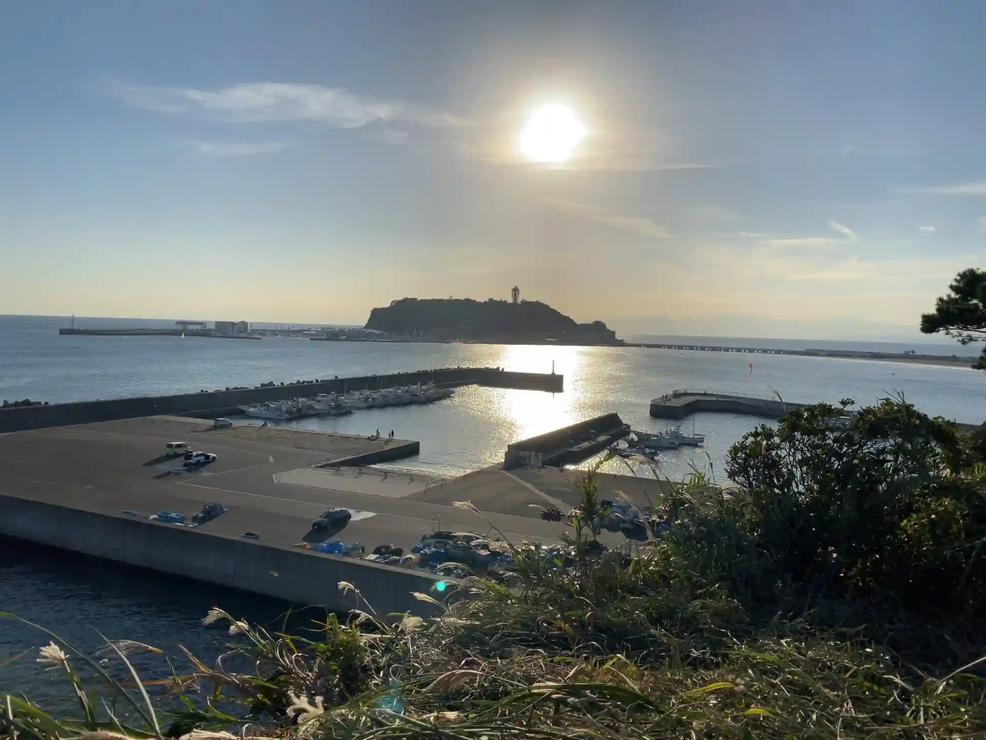 夕陽を浴びた江ノ島が目の前に。