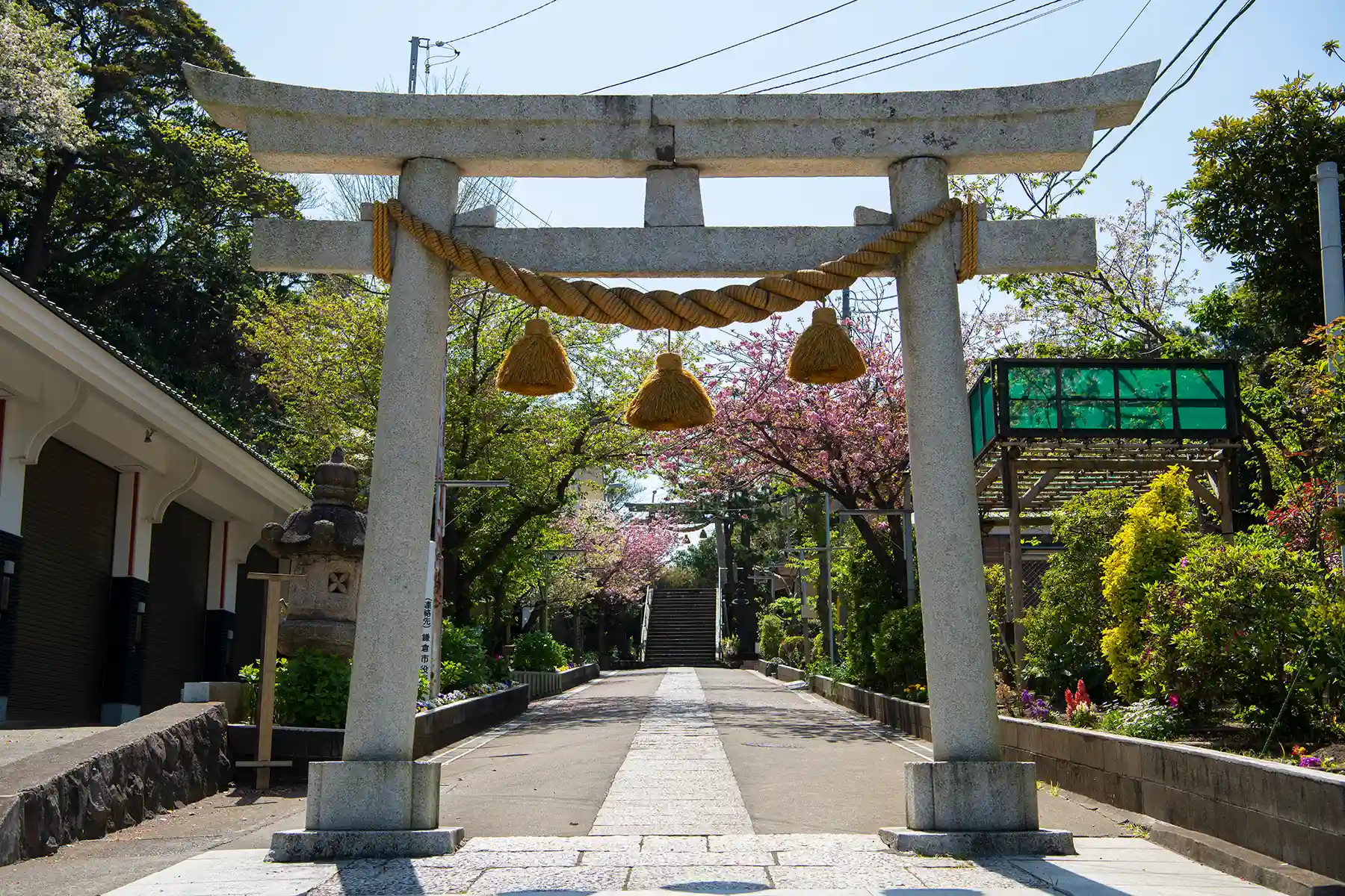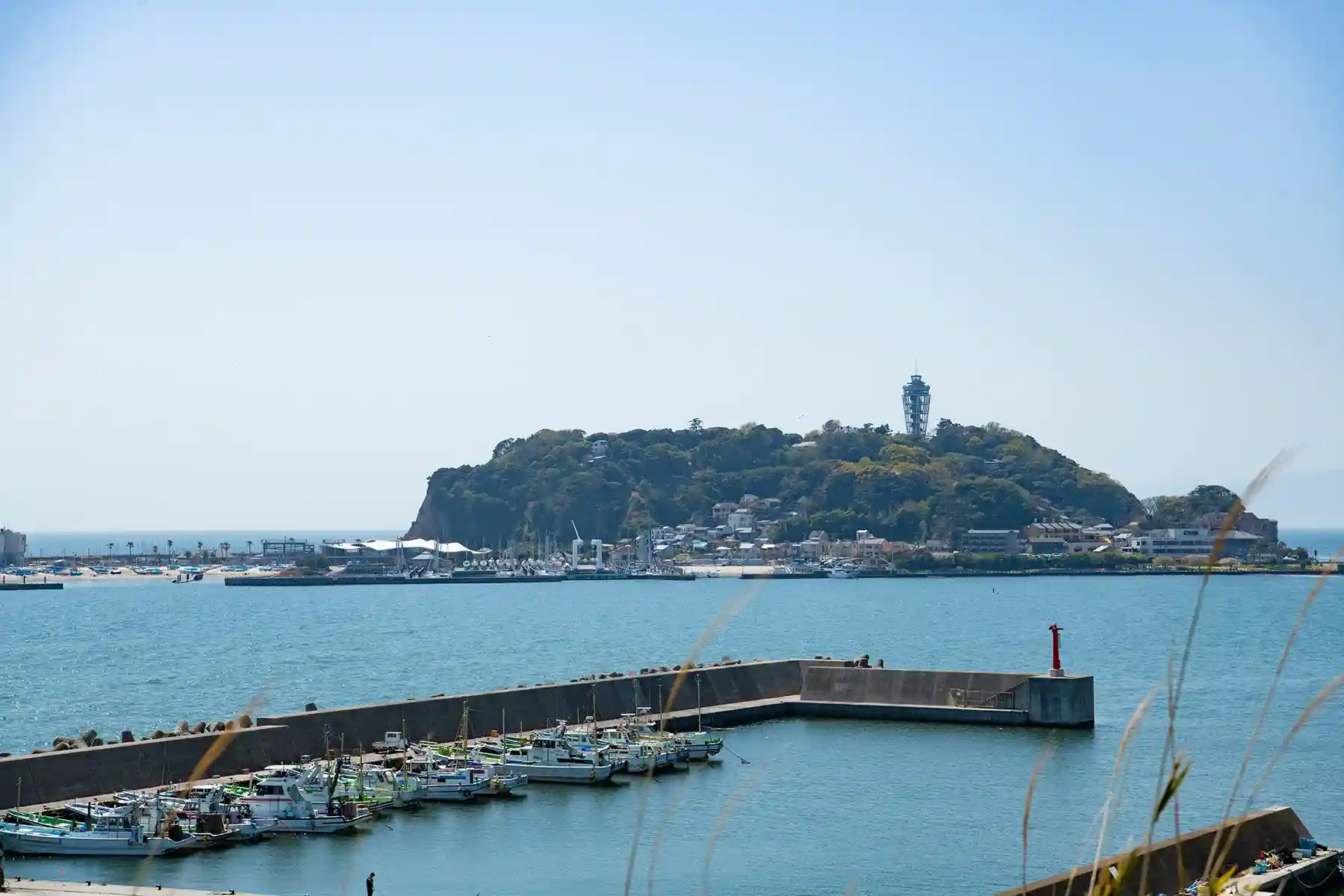 境内の高いところに登ると、近くに江ノ島が見え、心地よい風がそよいでいました。