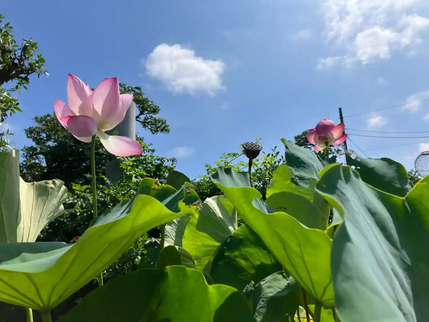 お寺の境内でお経を聞きながら実を結んだ蓮の実が