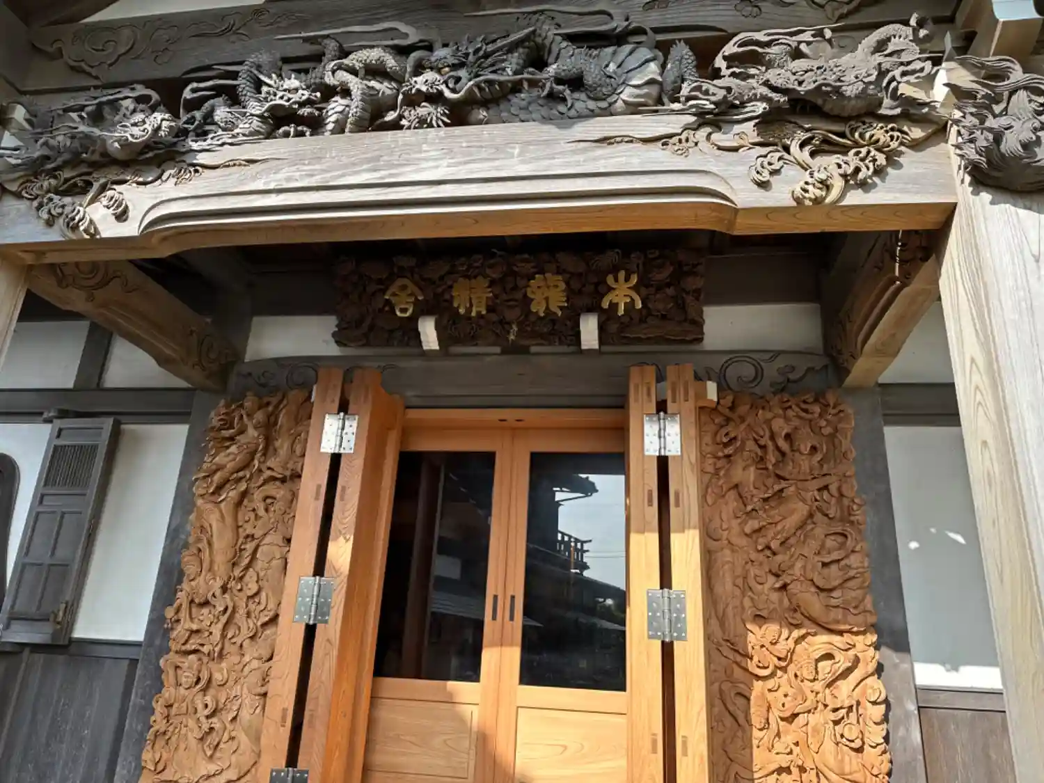 05-2) 本堂に向かって中央上方の彫刻 と 扁額 ’ 本龍精舎 ’