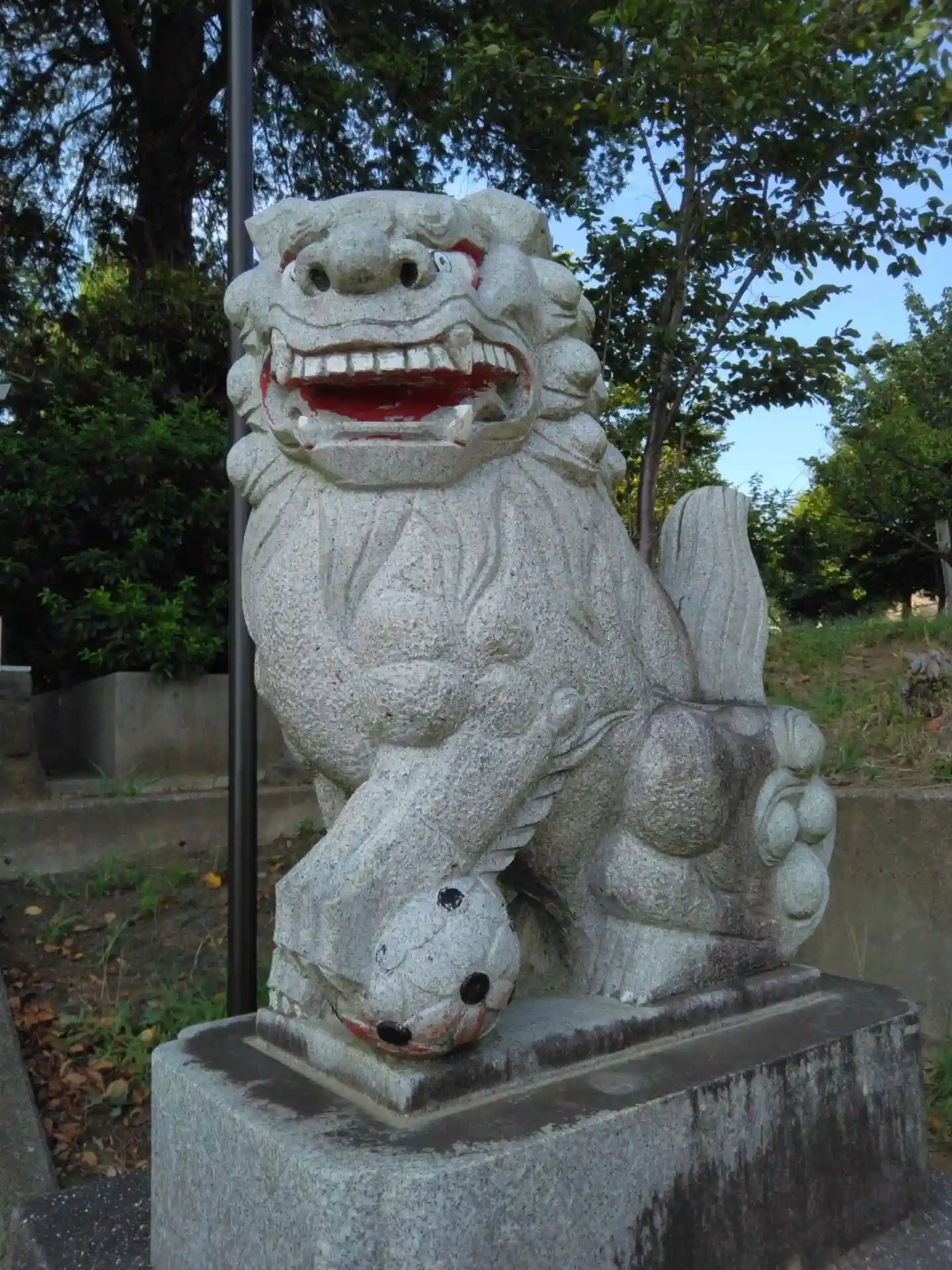 拝殿前の狛犬さん。顔が一部欠けています。