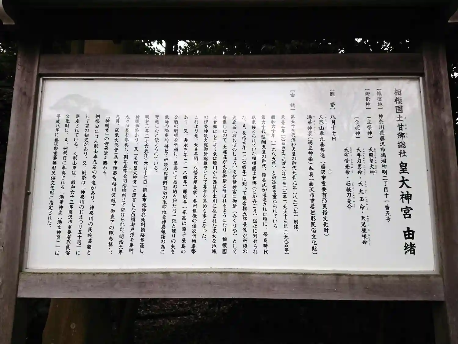 | ご祭神 | 《主》天照皇大神 《合》天児屋根命,天手力男命,天太玉命,天宇受売命,石凝刀売命 《摂末社》石楯尾大神,八幡大神,春日大神 |