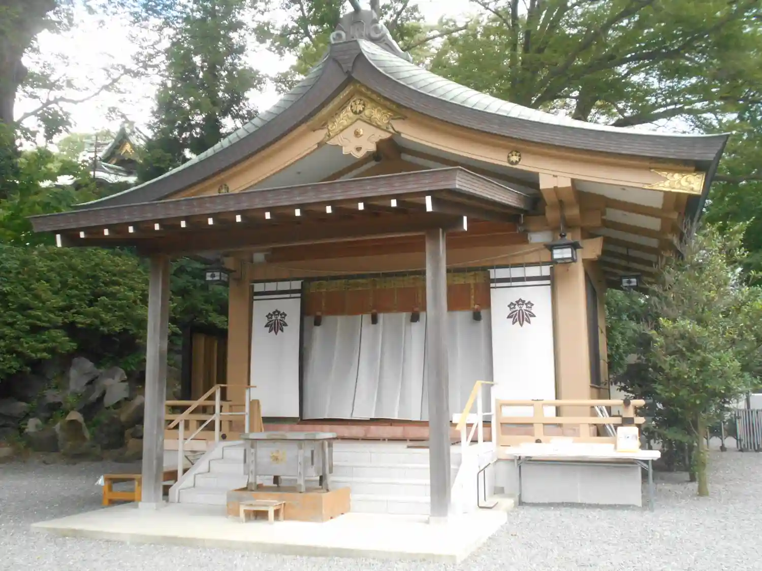 写真左奥 は社務所(と 弁慶藤棚)、右奥は義経藤棚。