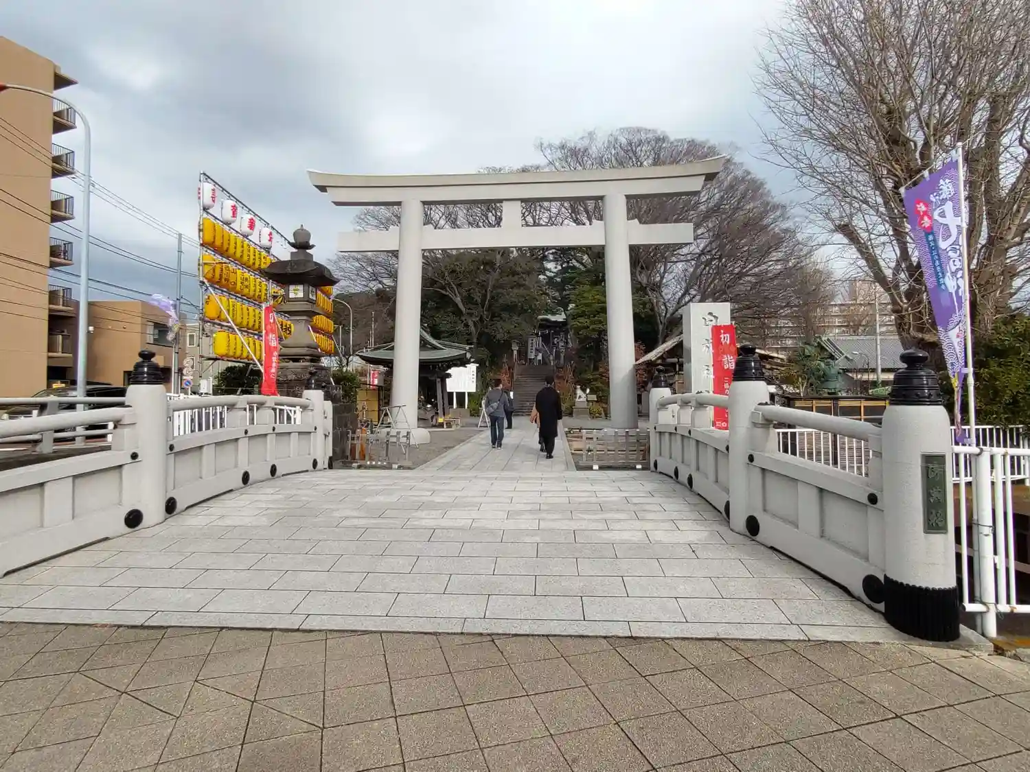 橋を渡って大きな石鳥居…