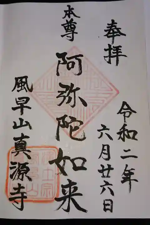 風早山真源寺です。浄土宗のお寺です。小田急泉藤沢本町駅からすぐのところにあります。こじんまりしたお寺ですが、ちょっと階段をあがったところに本堂や墓地があるので、景色が良かったです。御朱印をお願いしましたら、快く対応くださりました。御本尊様の御朱印をいただきました。