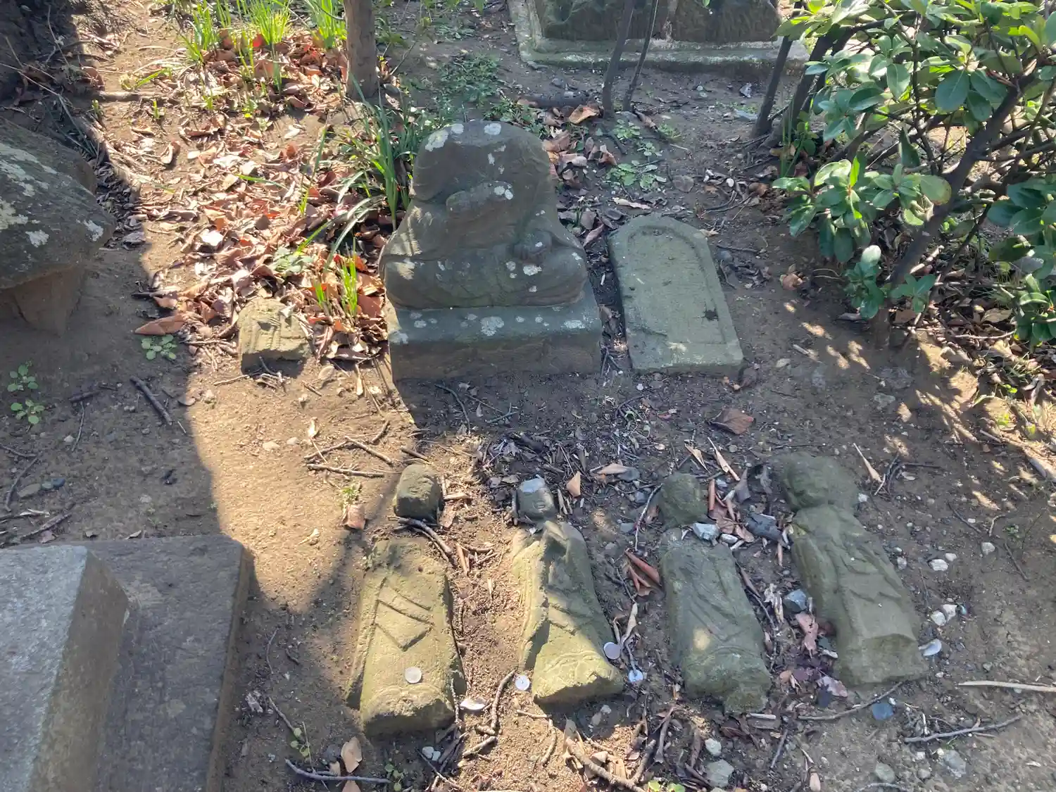 地面に埋まっているお地蔵様、よく見ると破損しています。