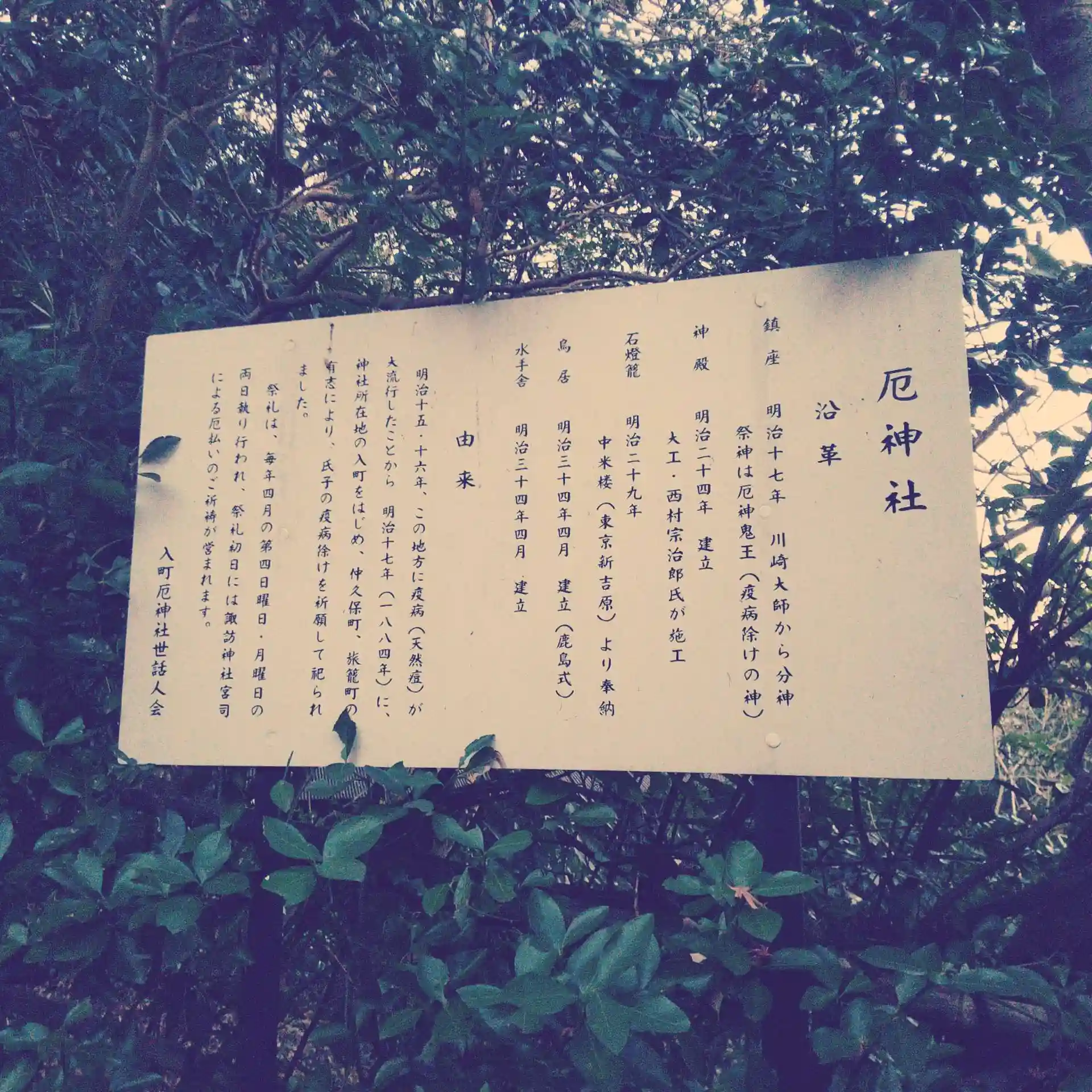 「明治15・16年この地方に天然痘が大流行したことから明治17年(1884年)に所在地の入町をはじめ、仲久保町、旅籠町の有志により、氏子の疫病除けを祈願して祀られました」とのこと(引用)