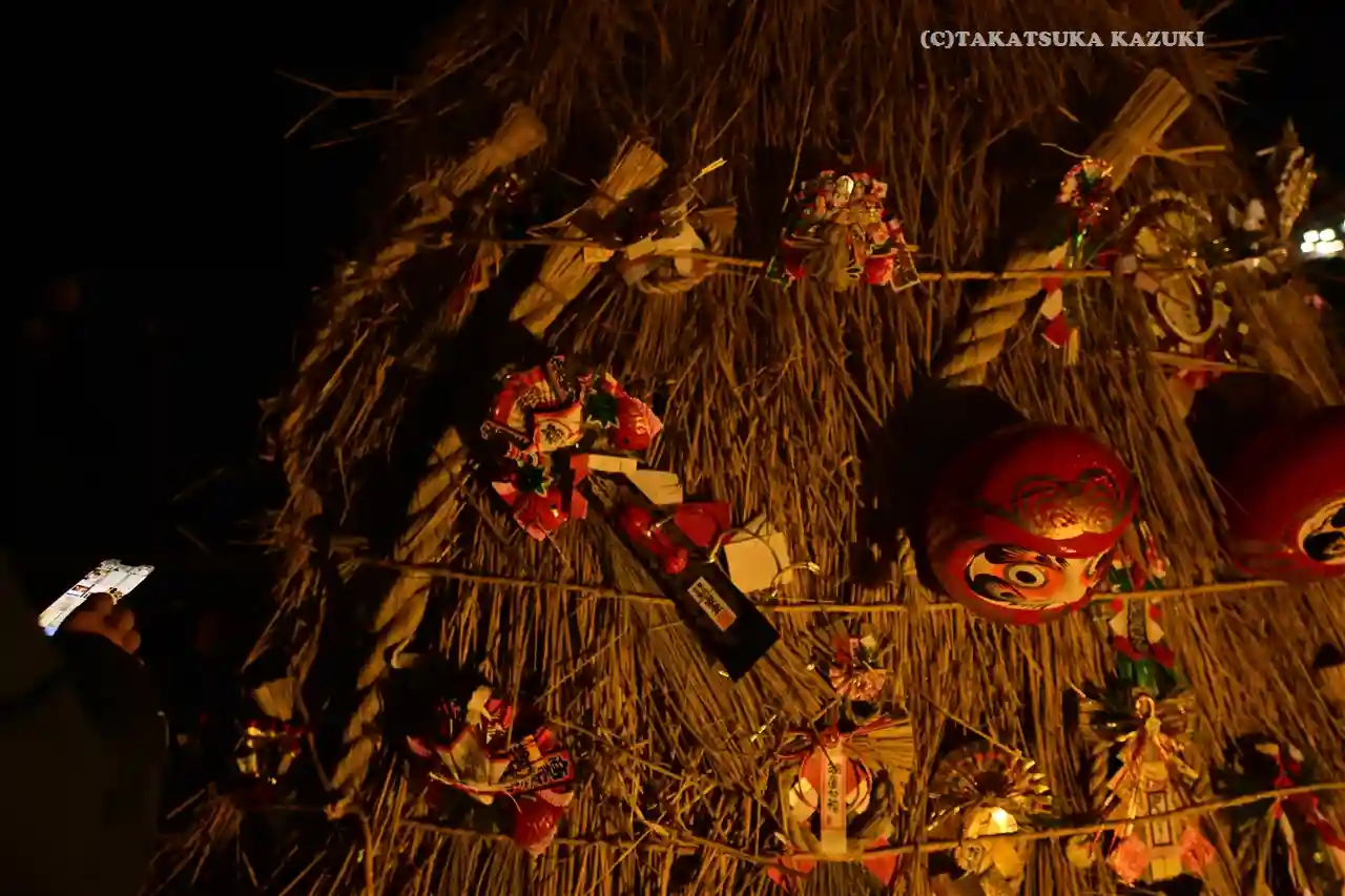 むかしがたりによると、12月8日は、目一つ小僧という疫病神が来て、人々の1年間の行いを帳面につけて回るそうです。目一つ小僧は、1月15日に取りに来るといって道祖神に帳面を預けますが、道祖神は前夜に自家もろとも帳面を焼いてしまい、それが祭の始まりといわれています。また、豆腐を食べると風邪をひかないといわれています。