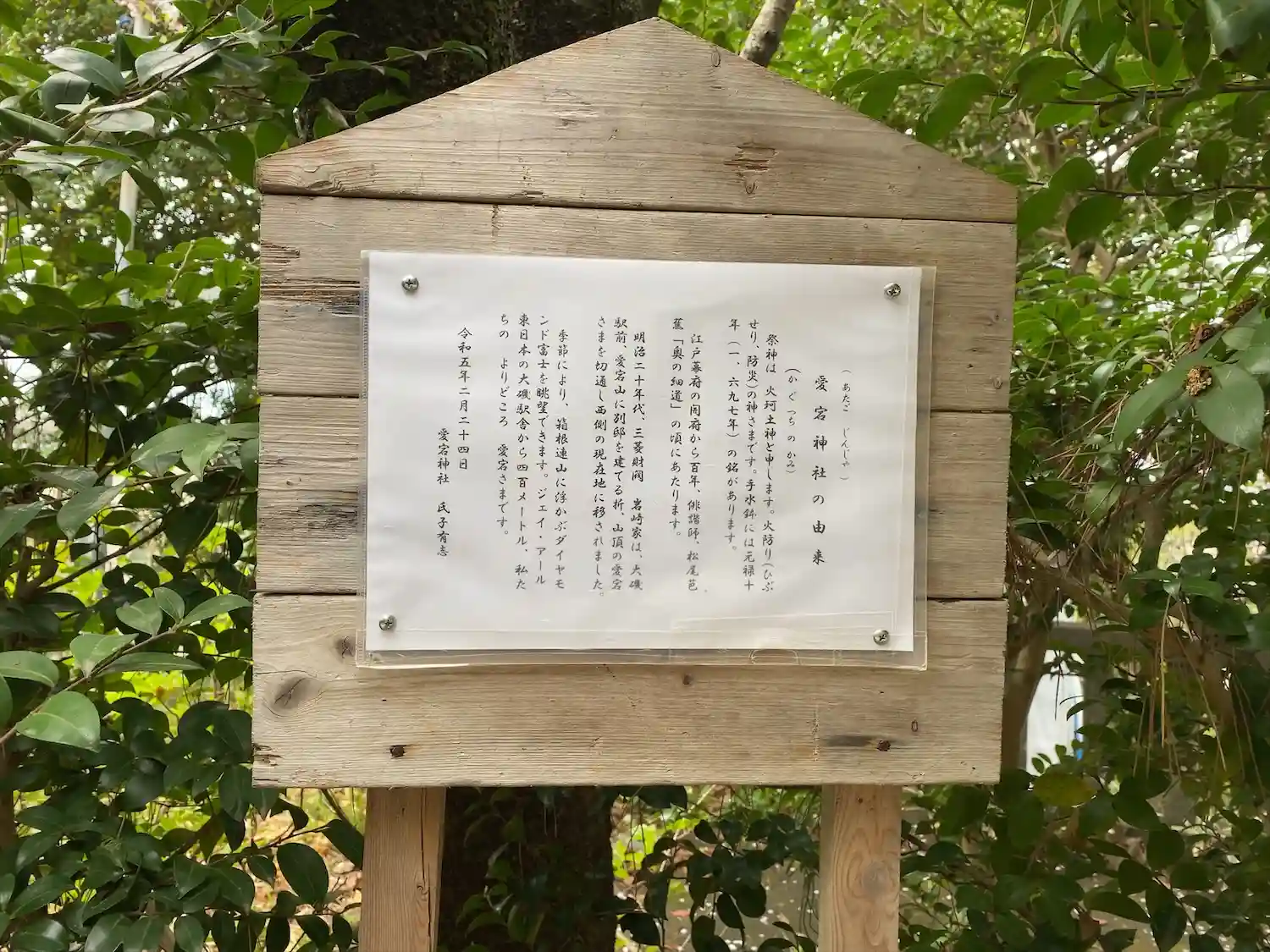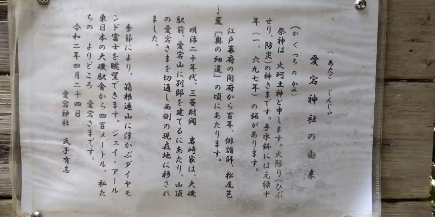神奈川県中郡大磯町大磯に鎮座する愛宕神社であり、大磯宿の火防の神として火具土命を祀る。