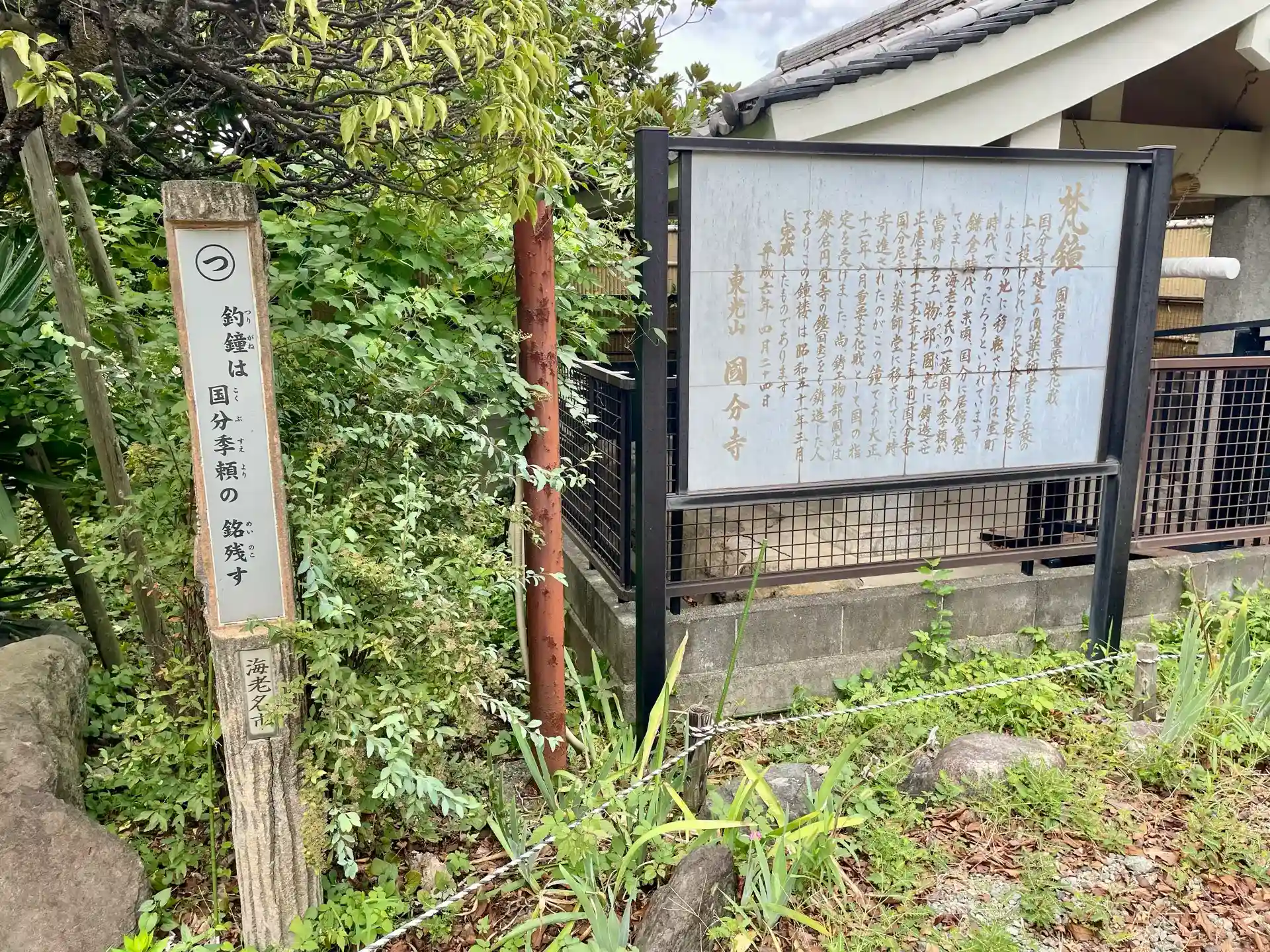 銅鐘は正応5年(1292)、国分に居館を構えていた海老名氏の一族であった国分季頼が国分尼寺に寄進したもので、名工・物部国光の作である。