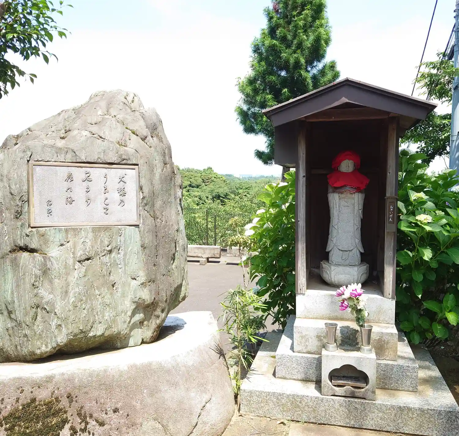 参道右側、見晴しの良い場所に地蔵様と石碑。