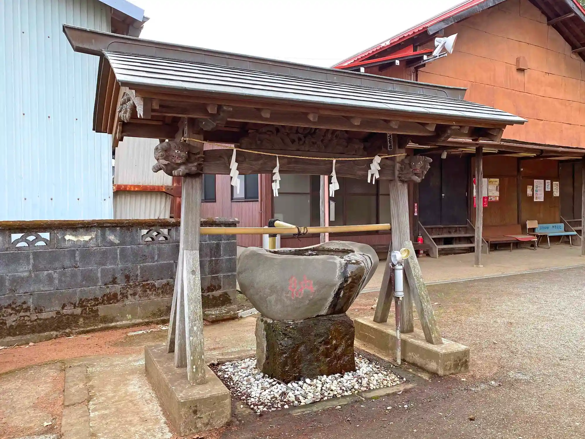 鳥居の右手にある<手水舎>。屋根には彫刻があり、岩をくりぬいた水盤と凝った造り。