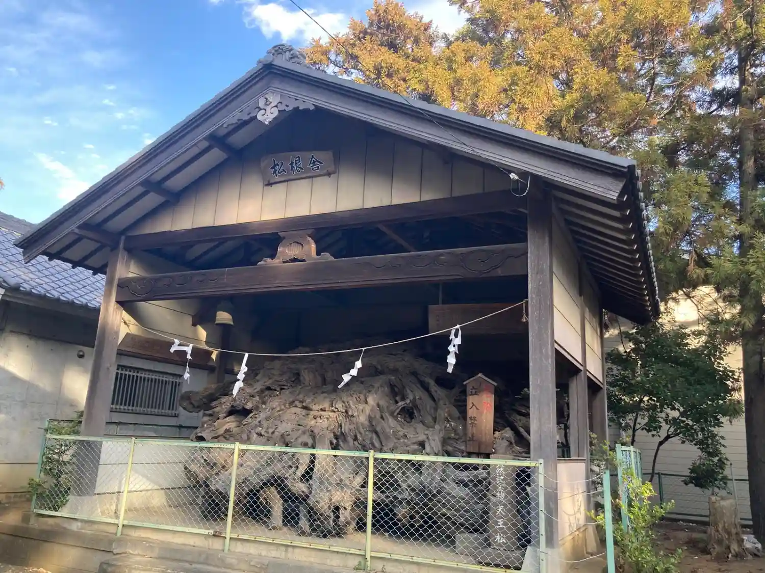 後に掘り出された巨大な天王松の根と往時を偲ぶ写真が社殿横の「松根舎」に展示してあります。ぜひご覧ください。